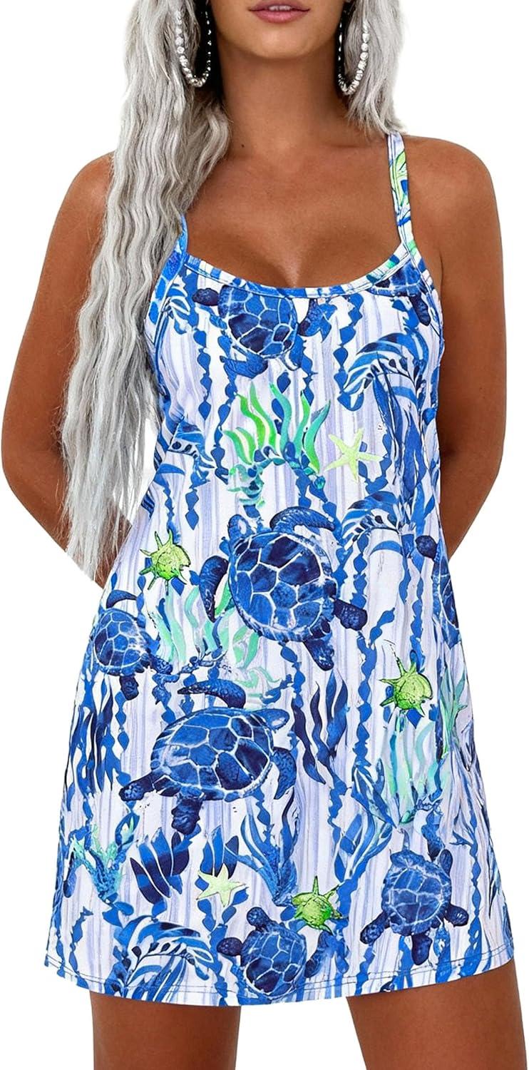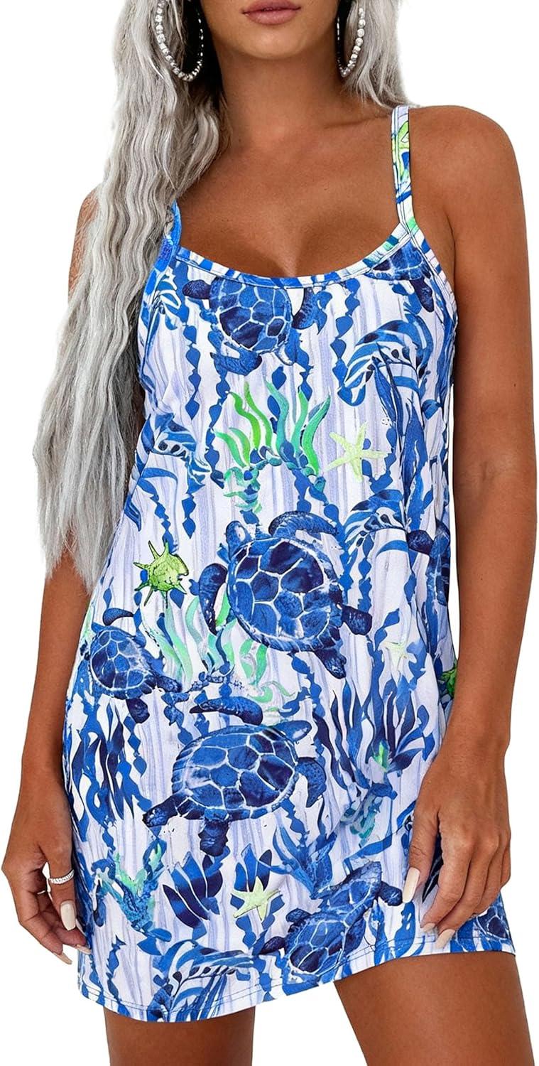 PRETTYGARDEN Women’s Summer Dresses 2026 Casual Print Spaghetti Strap Sleeveless Sundress Beach Vacation Cover Ups(Blue Green)