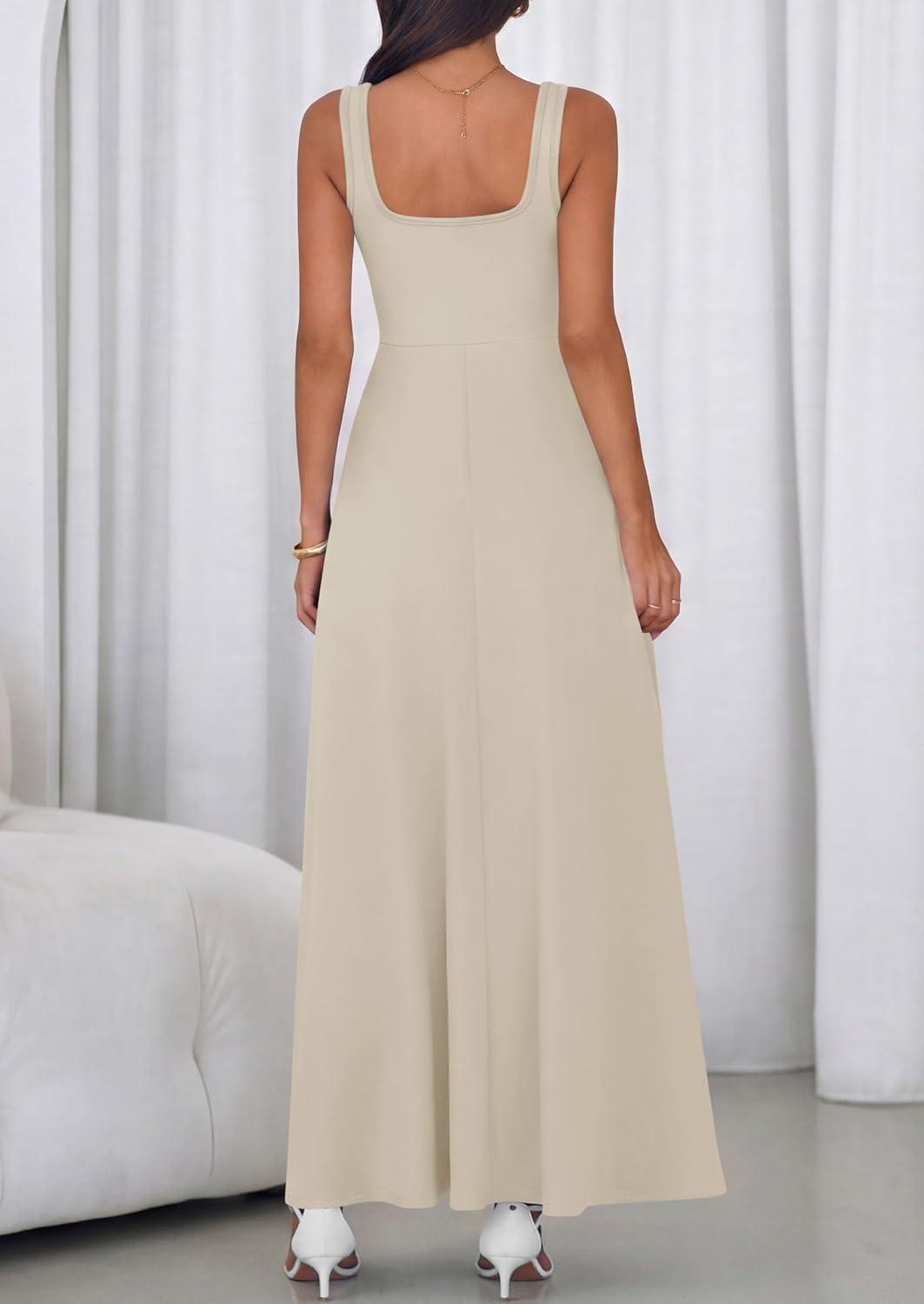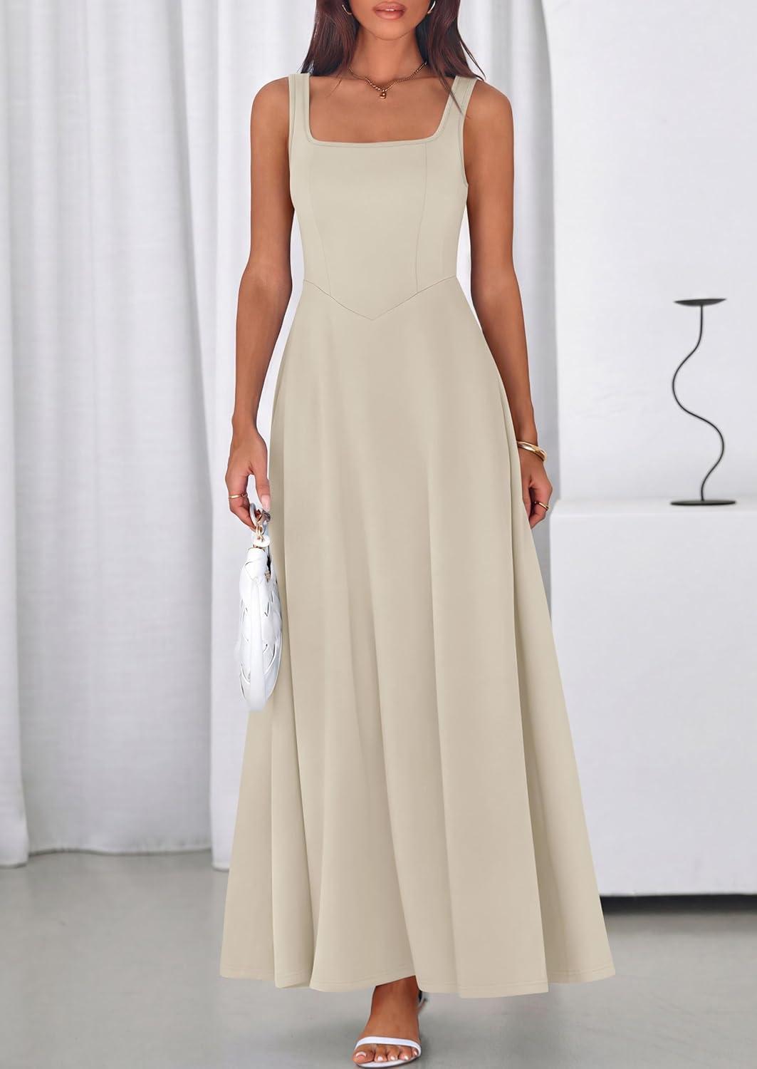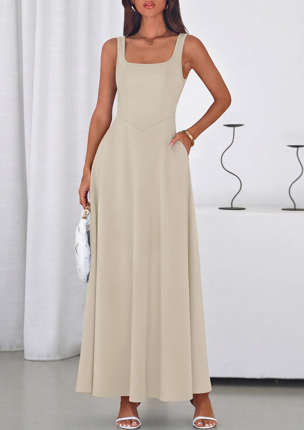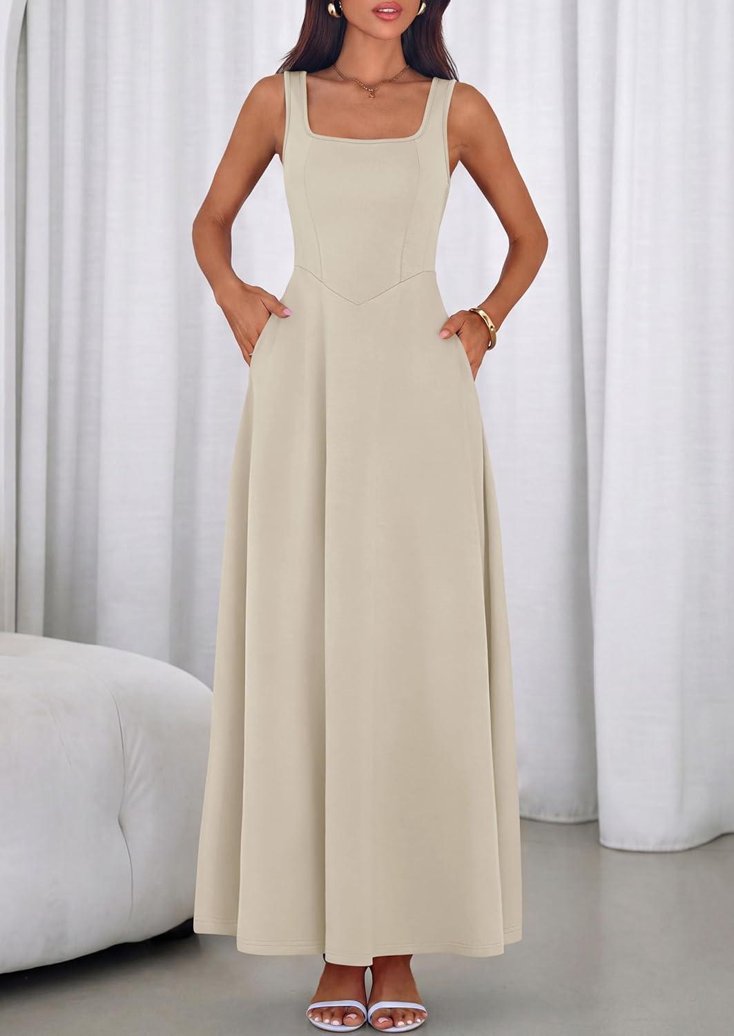 PRETTYGARDEN Womens Summer Dresses 2026 Sleeveless Elegant Square Neck Aline Swing Maxi Beach Wedding Guest Dress Pockets(Beige)