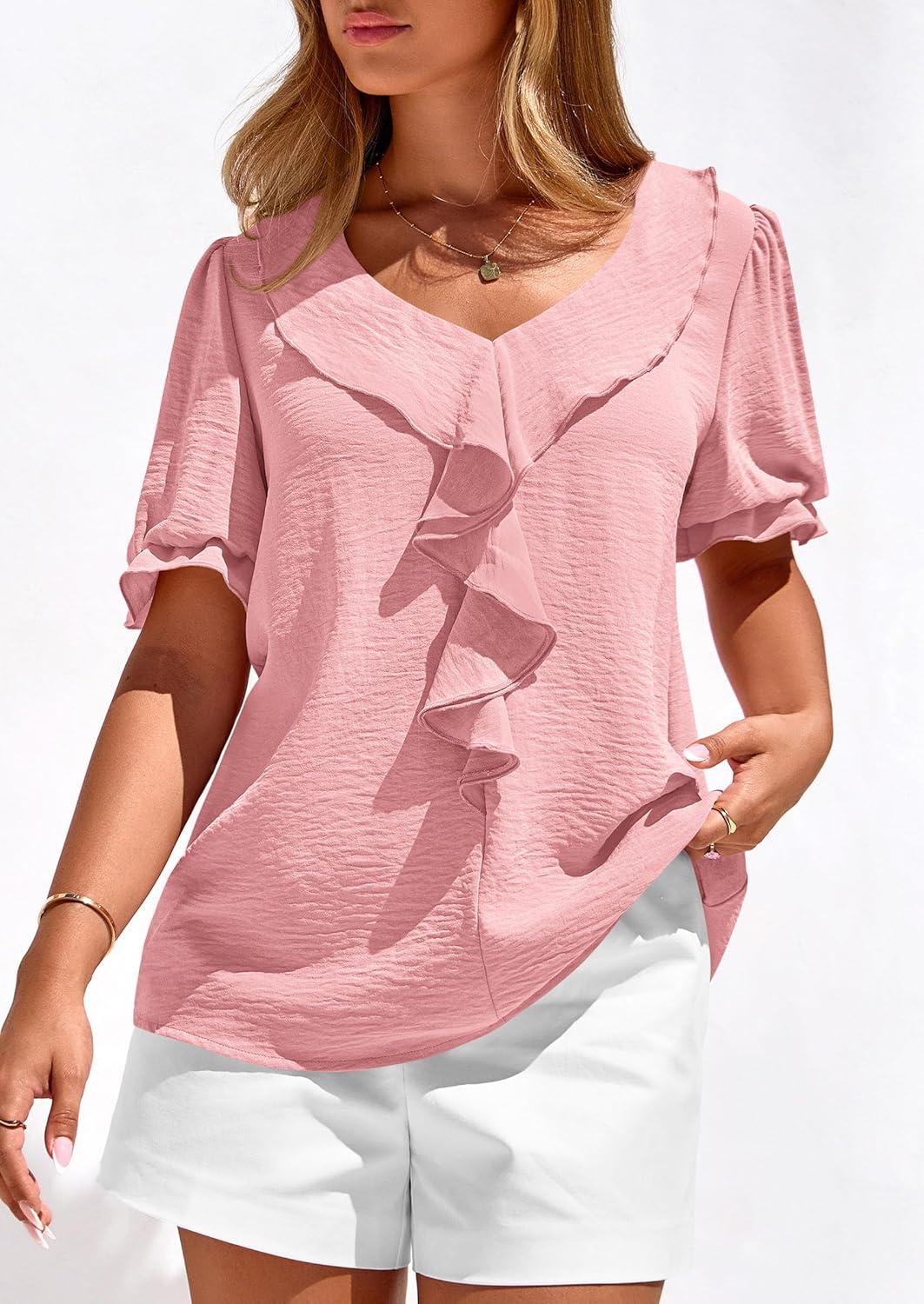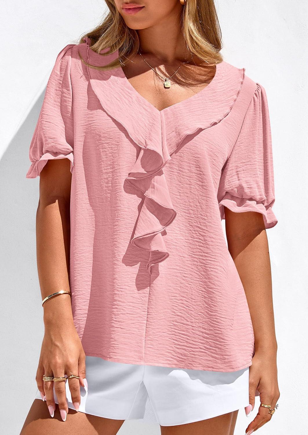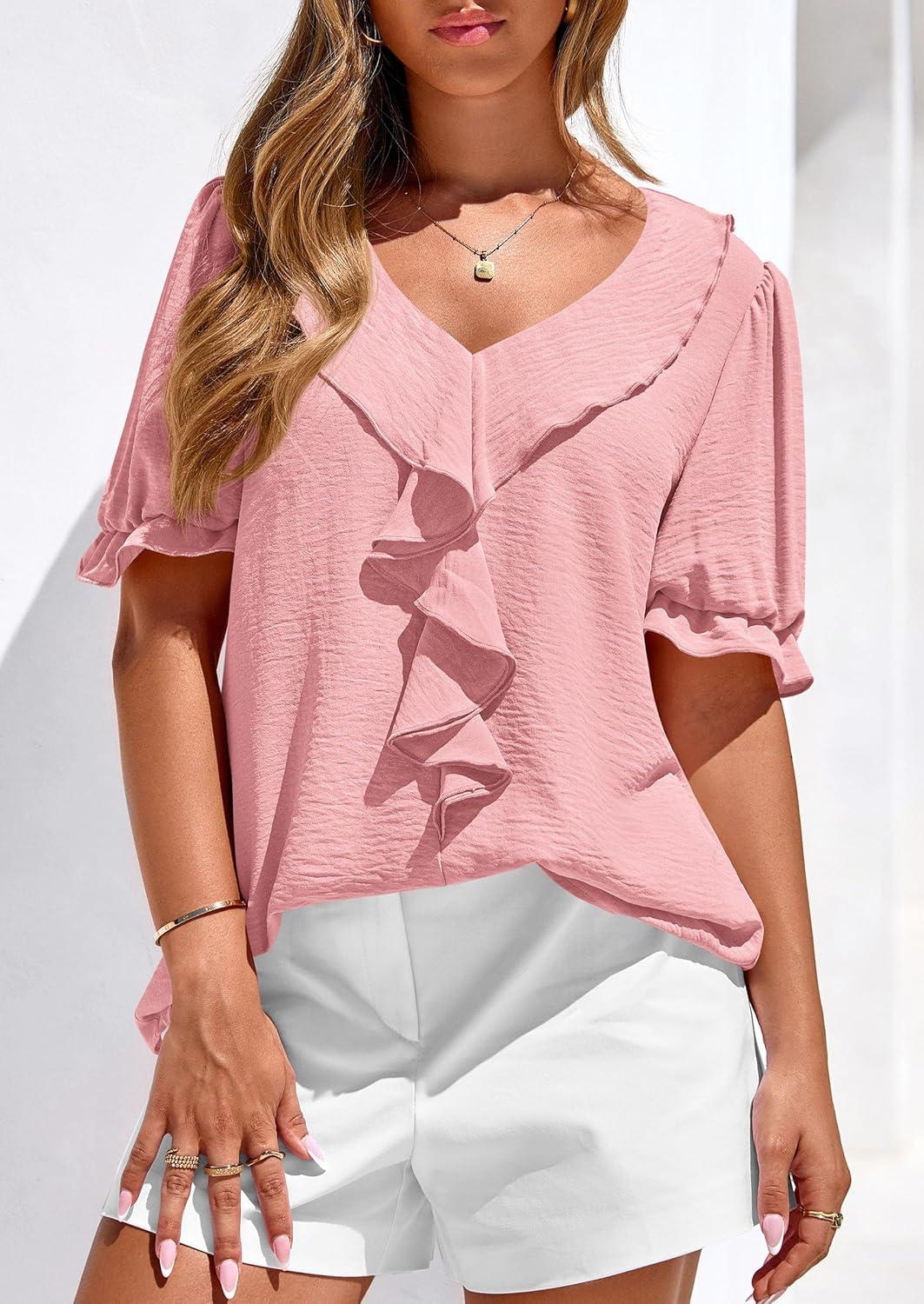 PRETTYGARDEN Women’s Summer Dressy Casual Blouses 2026 Short Sleeve V Neck Ruffle Going Out Tops Shirt Trendy Spring Outfits(Pink)