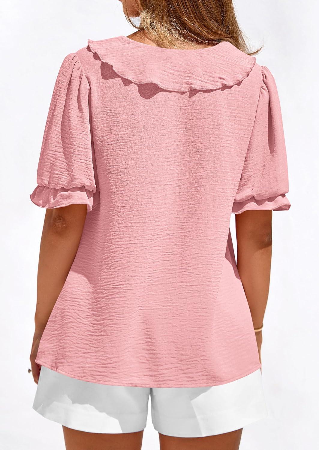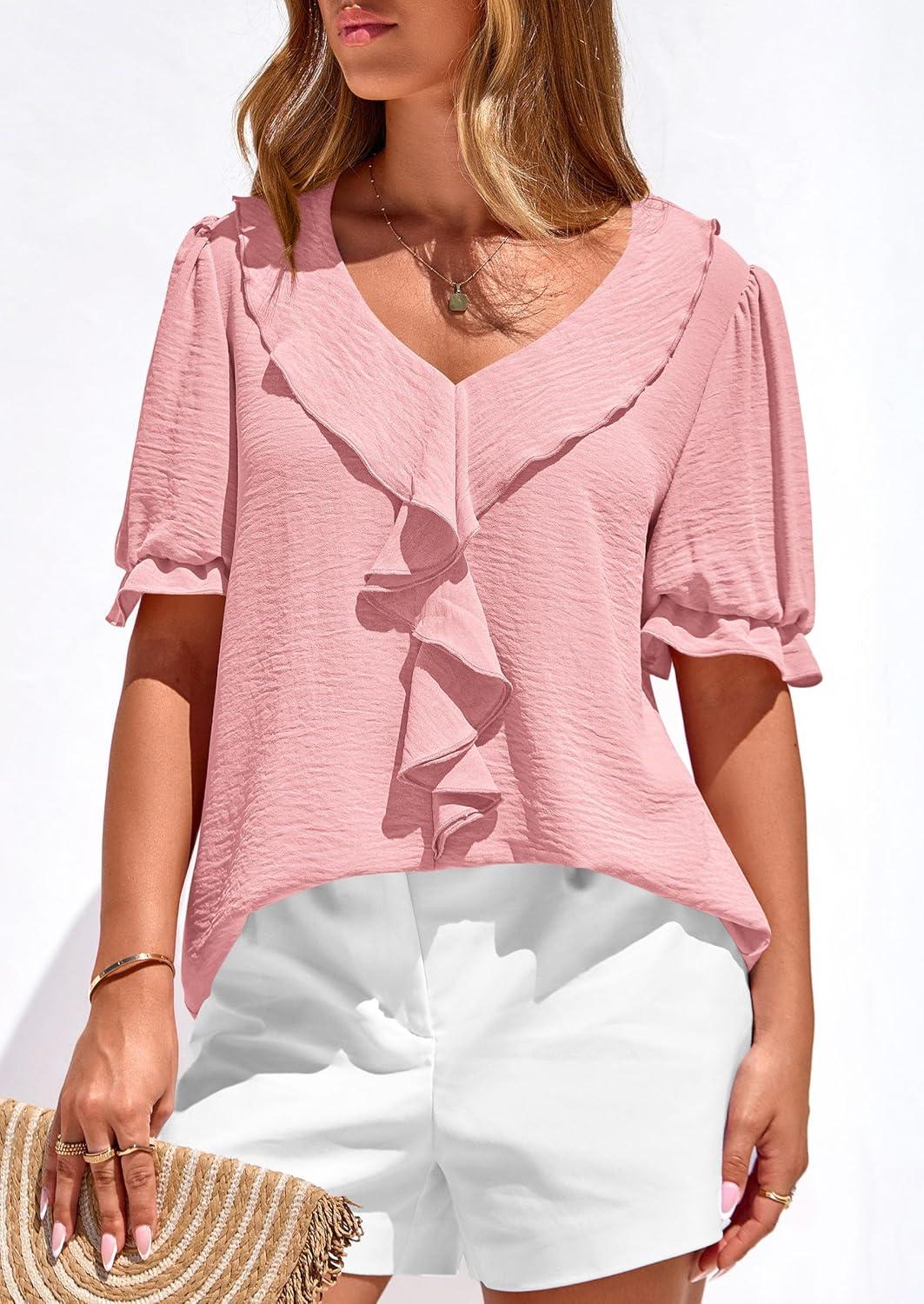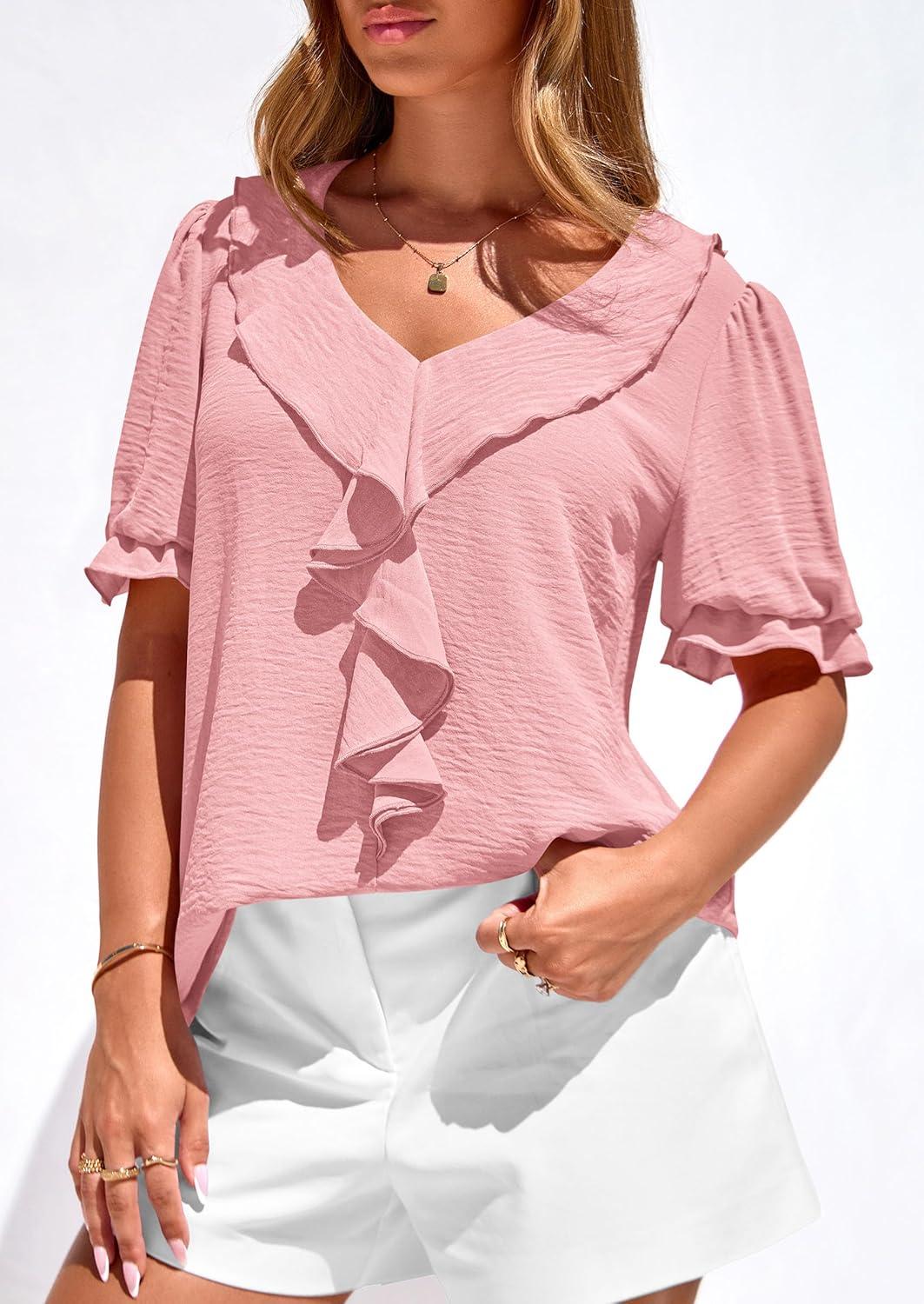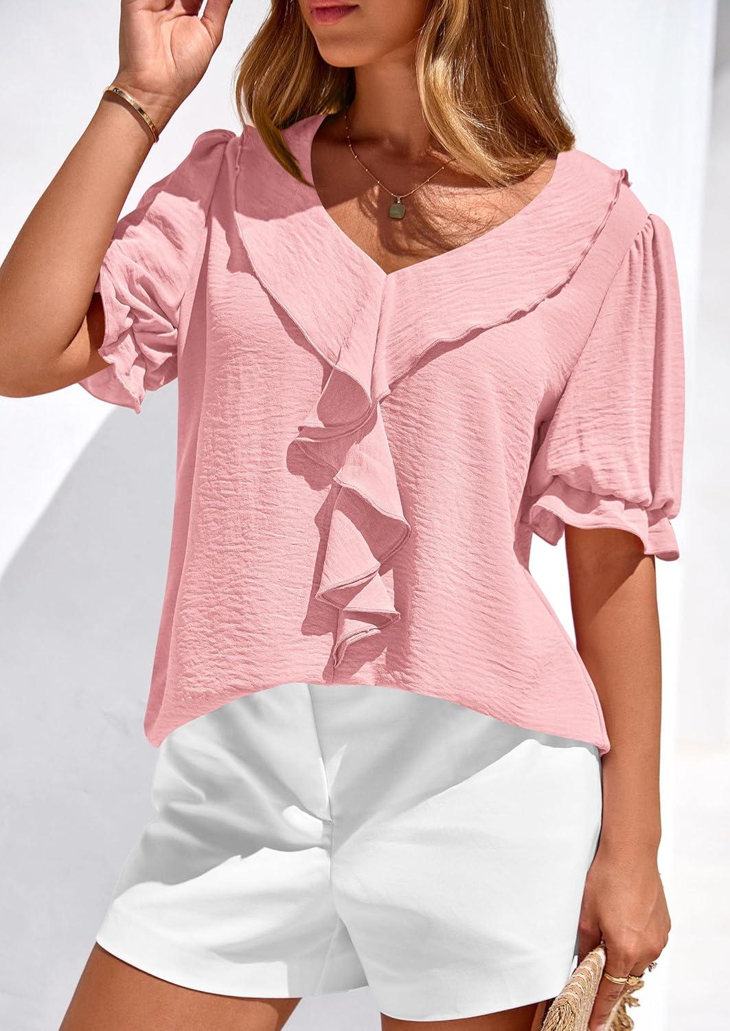 PRETTYGARDEN Women’s Summer Dressy Casual Blouses 2026 Short Sleeve V Neck Ruffle Going Out Tops Shirt Trendy Spring Outfits(Pink)