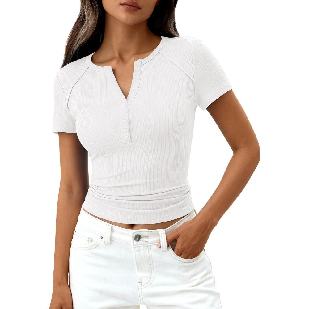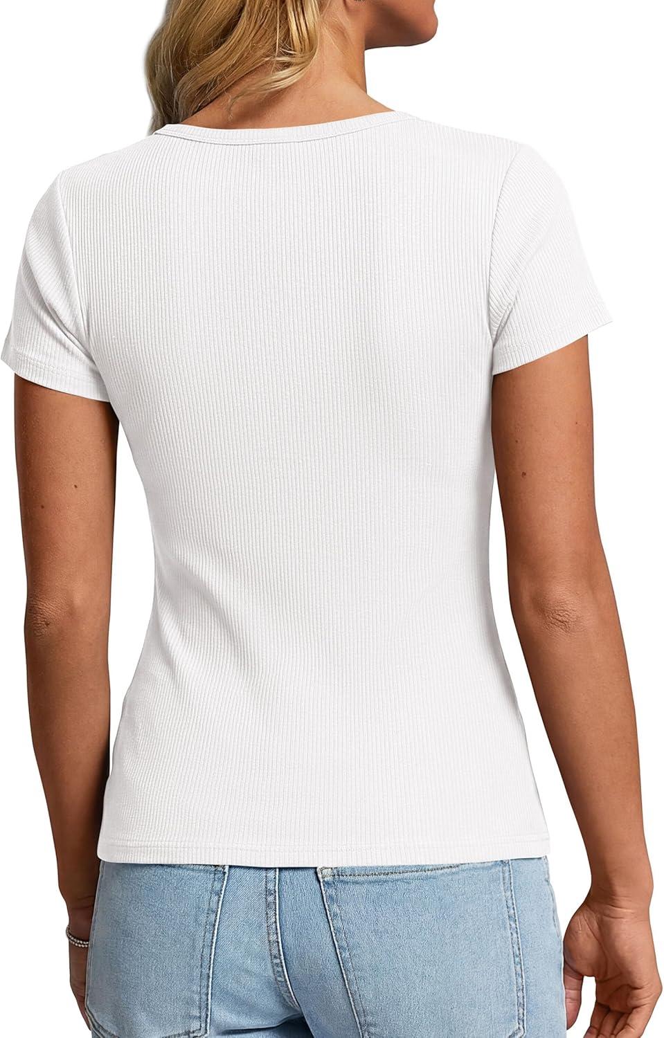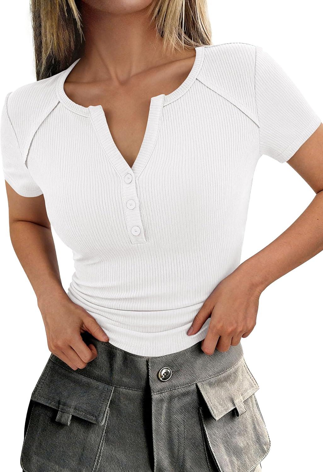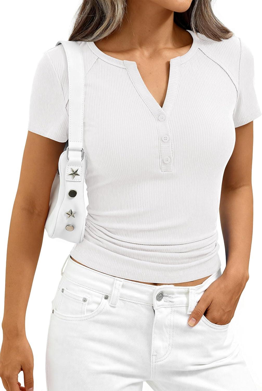 PRETTYGARDEN Ribbed Short Sleeve Tops For Women Summer Henley Tops Shirts