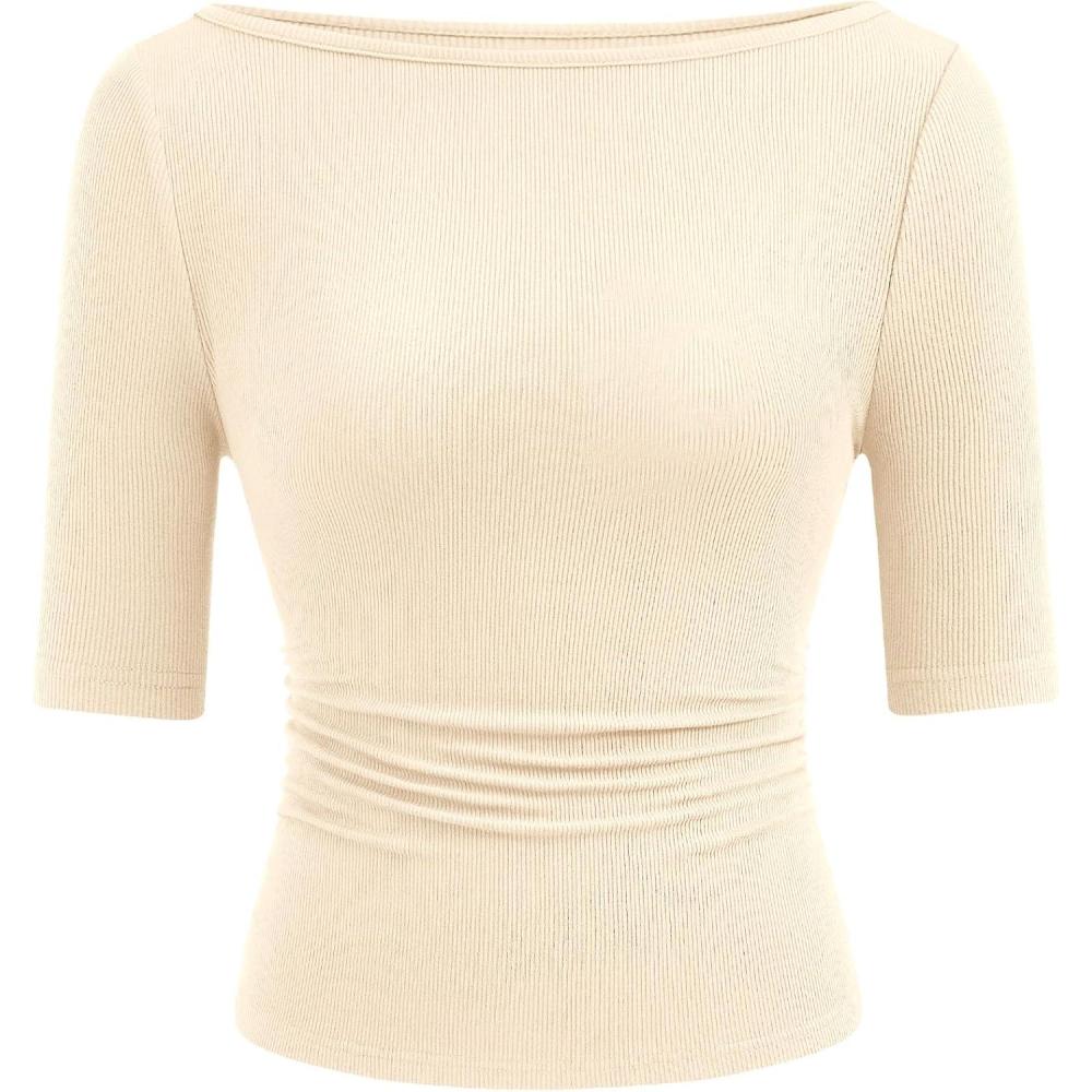 PRETTYGARDEN Womens Summer Short Sleeve Tops Boat Neck Ribbed Knit Slim Fit T Shirt Casual Basic Top 2026 Spring Clothes(Beige)