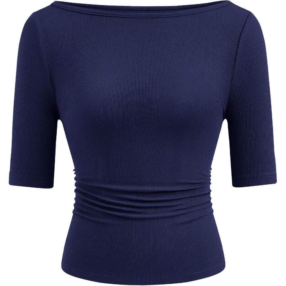 PRETTYGARDEN Womens Summer Short Sleeve Tops Boat Neck Ribbed Knit Slim Fit T Shirt Casual Basic Top 2026 Spring Clothes(Navy Blue)