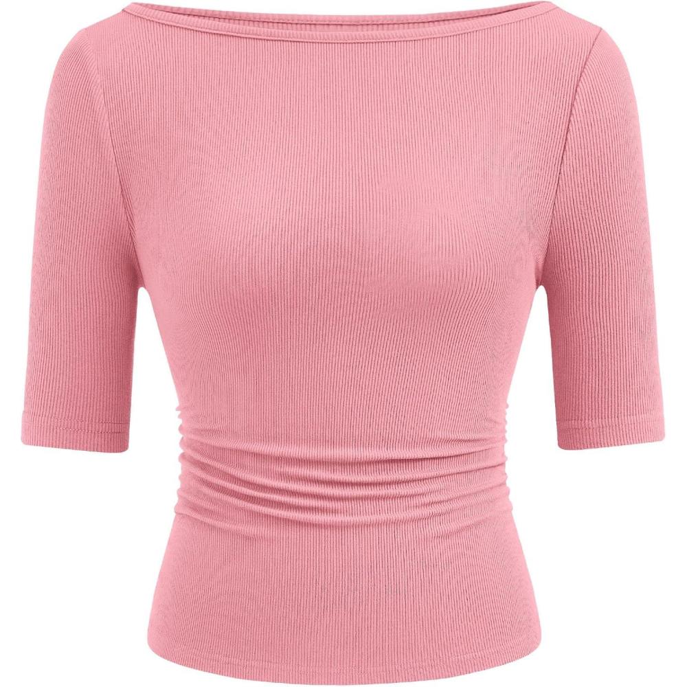 PRETTYGARDEN Womens Summer Short Sleeve Tops Boat Neck Ribbed Knit Slim Fit T Shirt Casual Basic Top 2026 Spring Clothes(Pink)