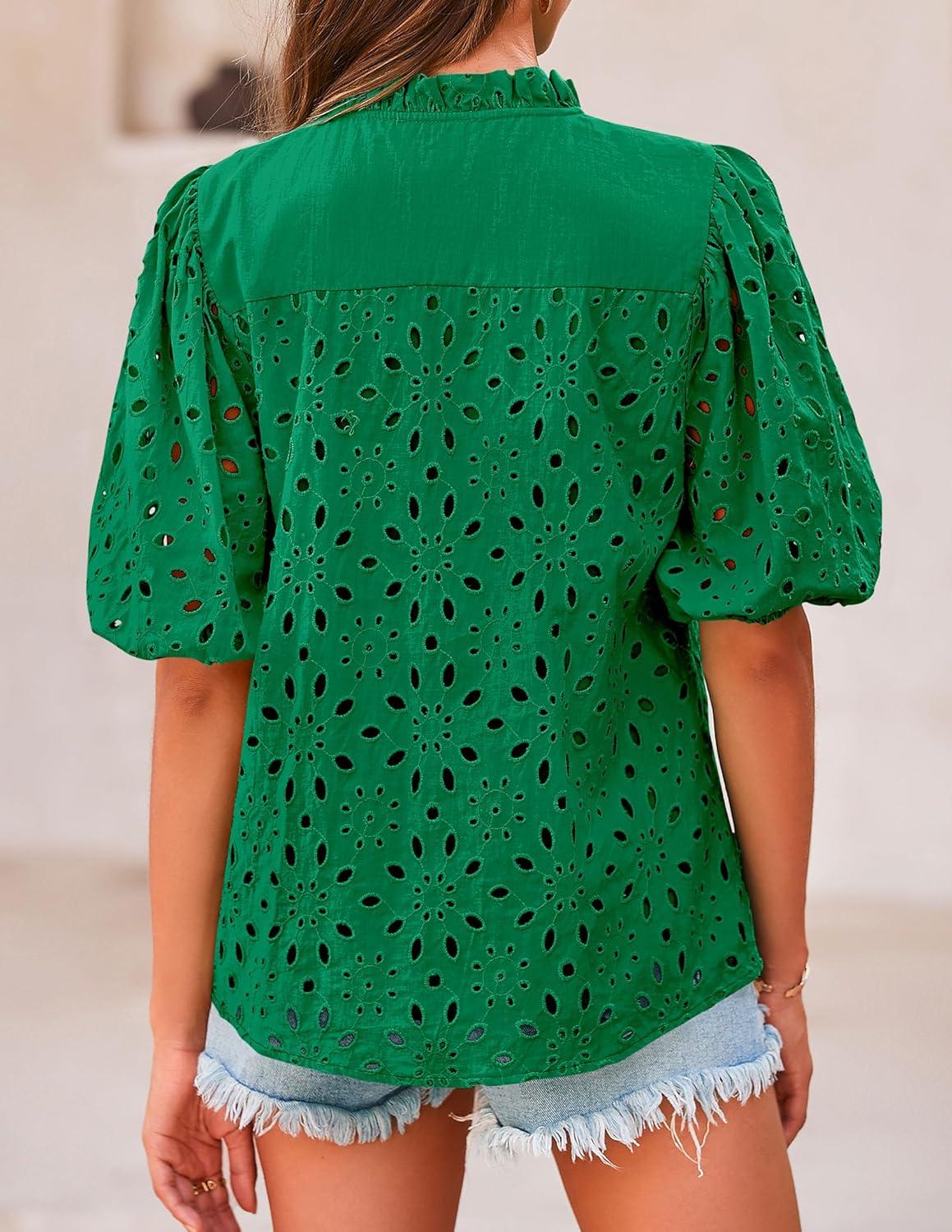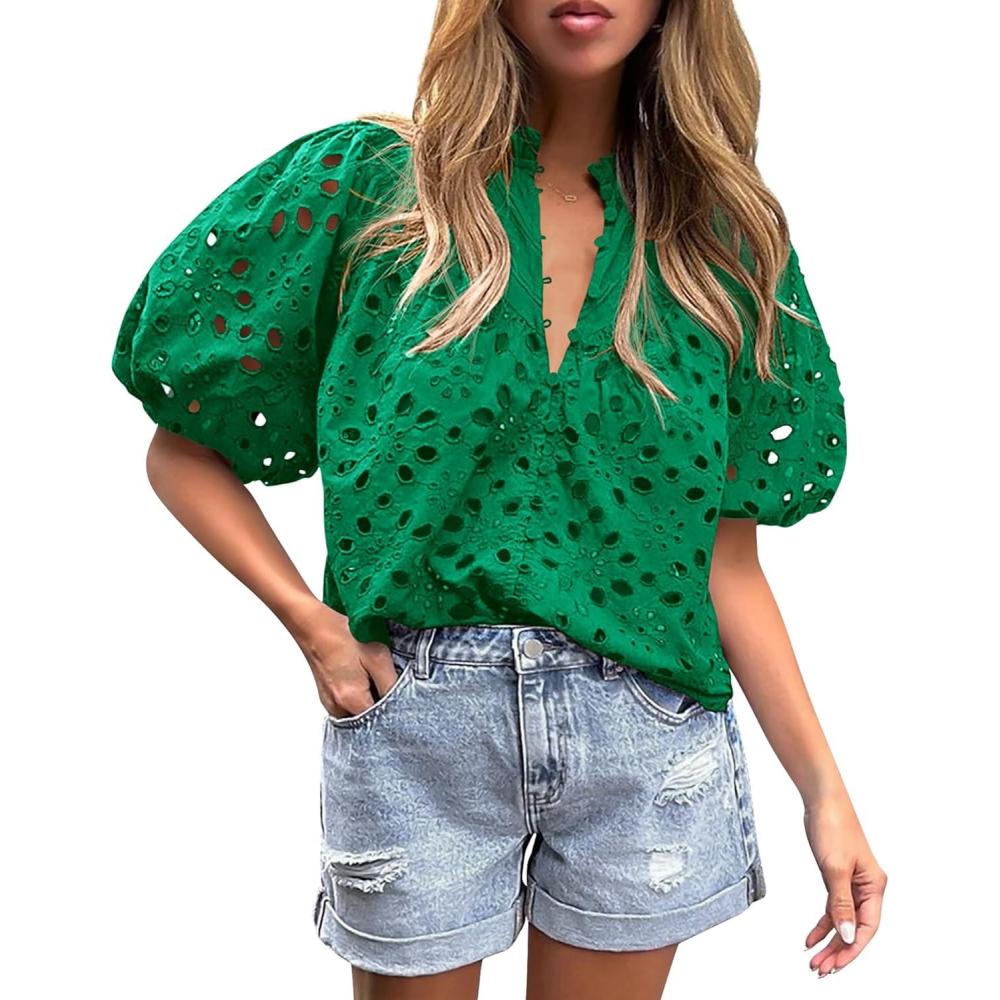 PRETTYGARDEN Women's Summer Tops 2025 Dressy Casual Short Sleeve V Neck Buttons Hollow Out Lace Embroidered Blouses Shirts(Dark Green)
