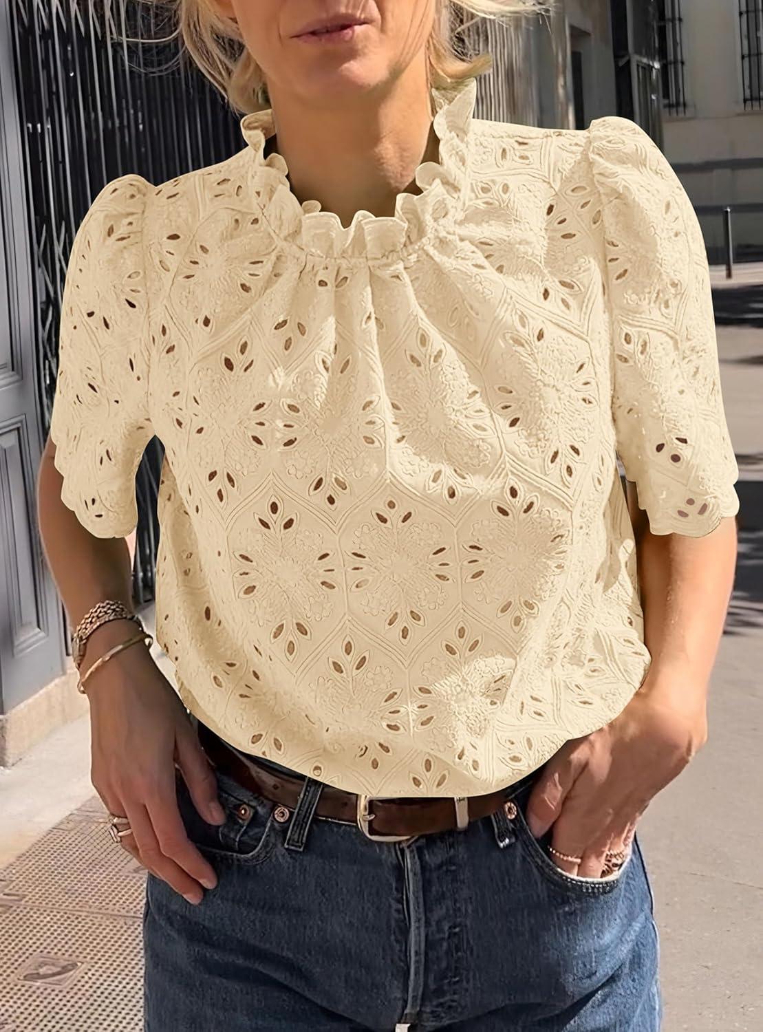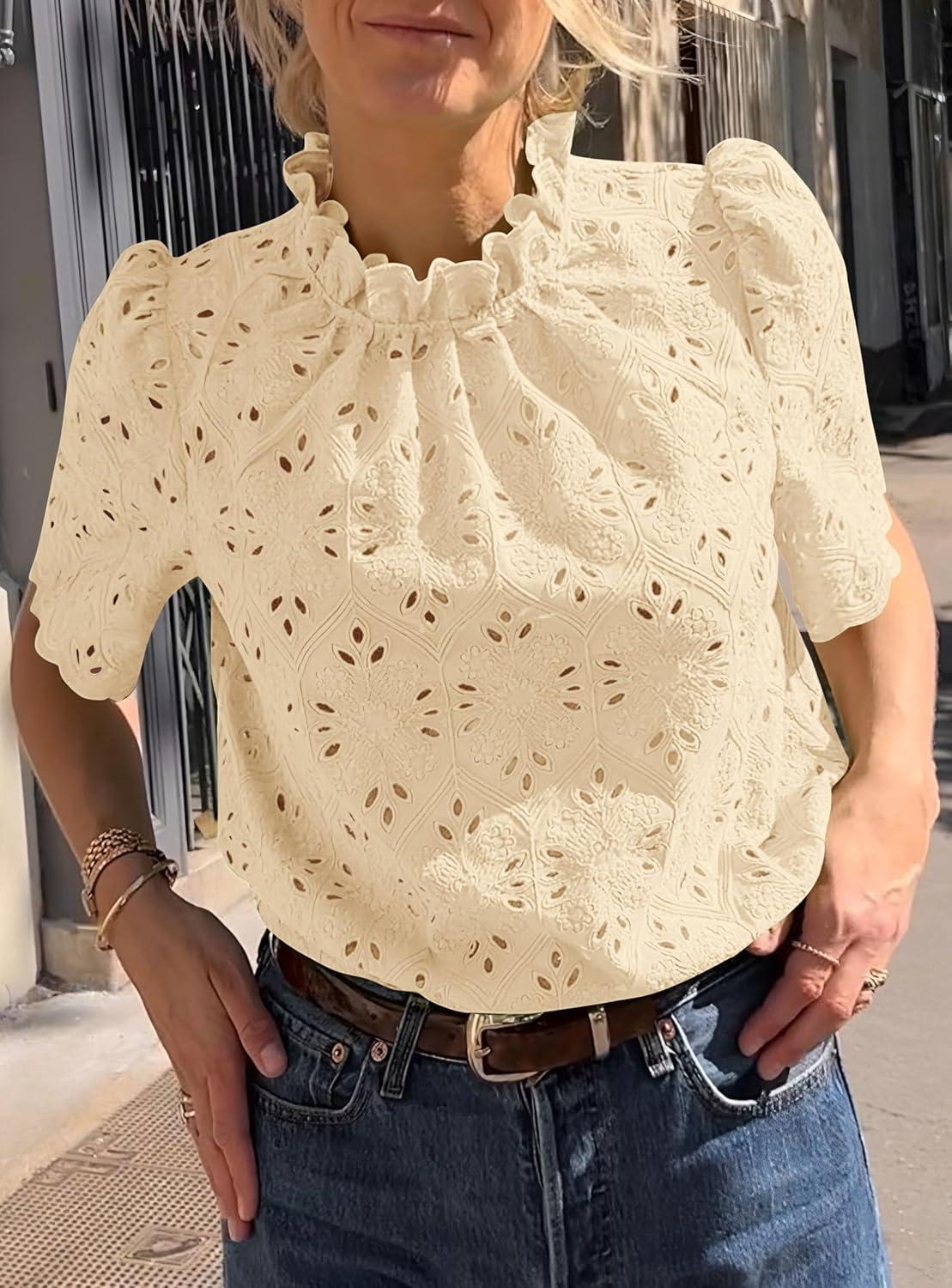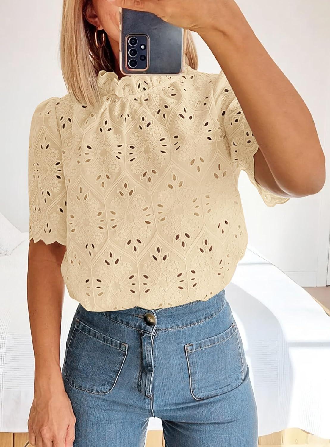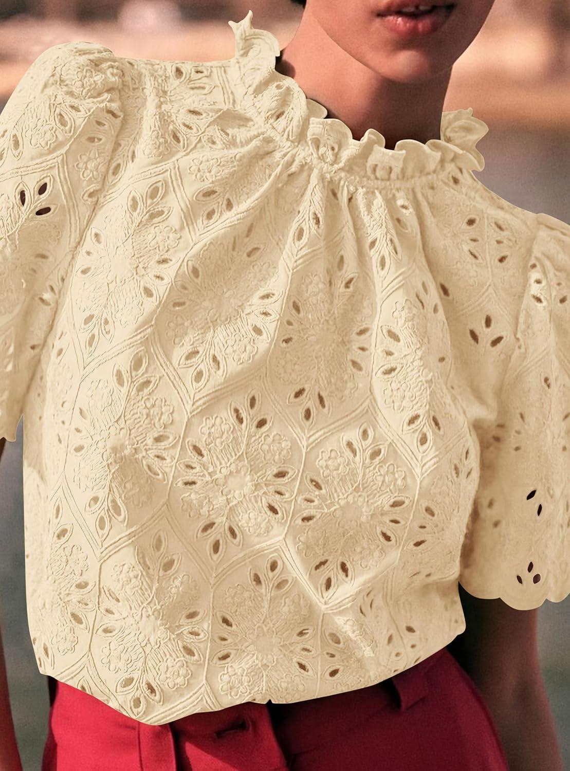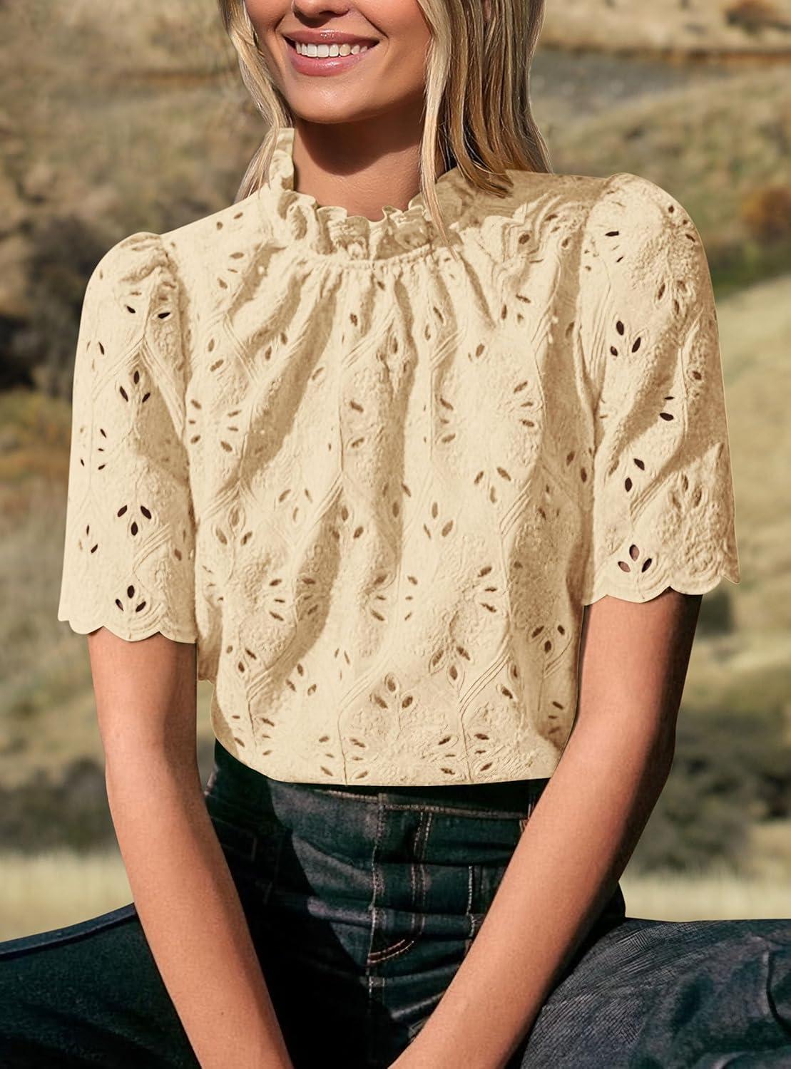 PRETTYGARDEN Womens Summer Tops 2025 Trendy Short Sleeve Eyelet Embroidered Dressy Casual Blouse Shirts(Beige Yellow)