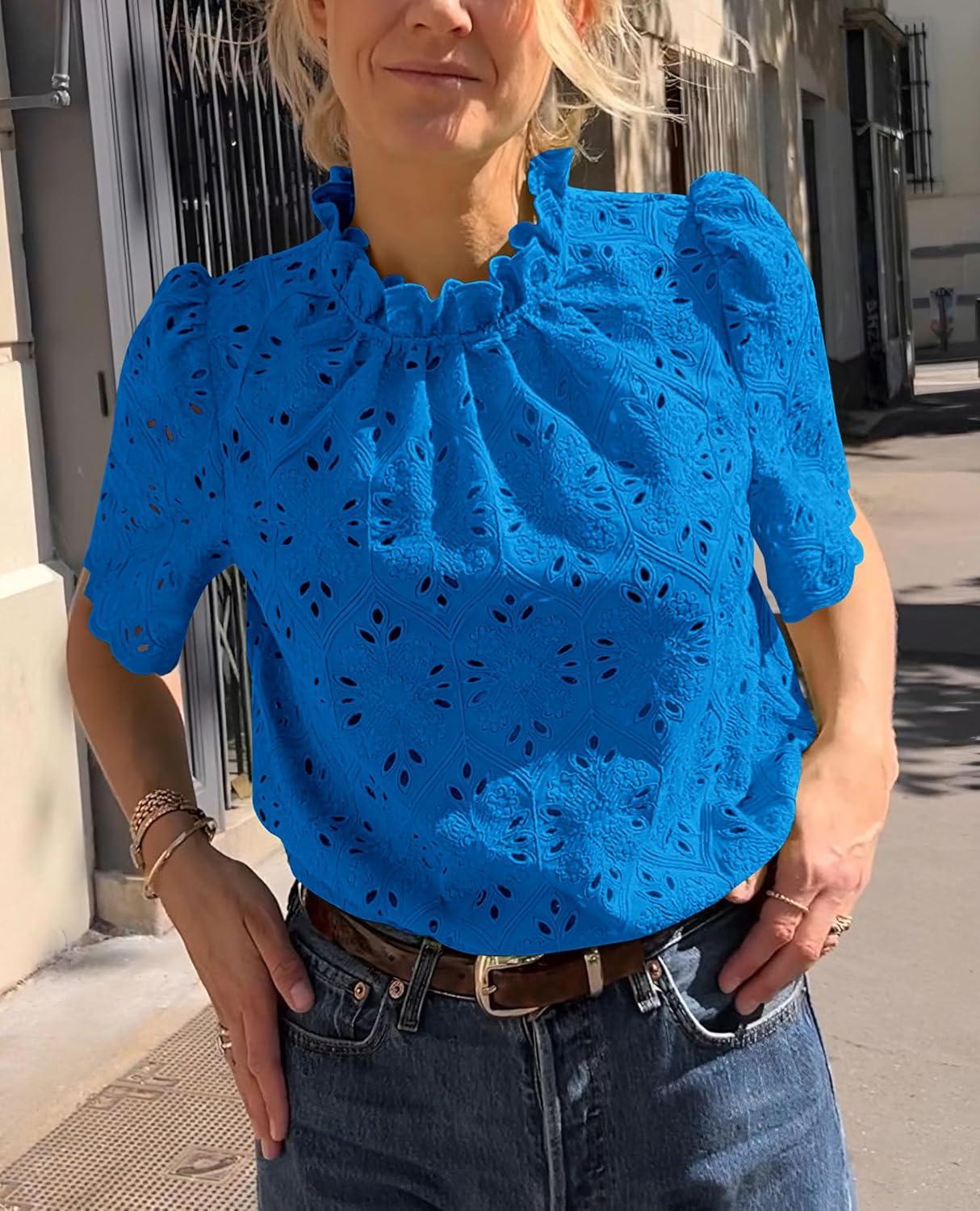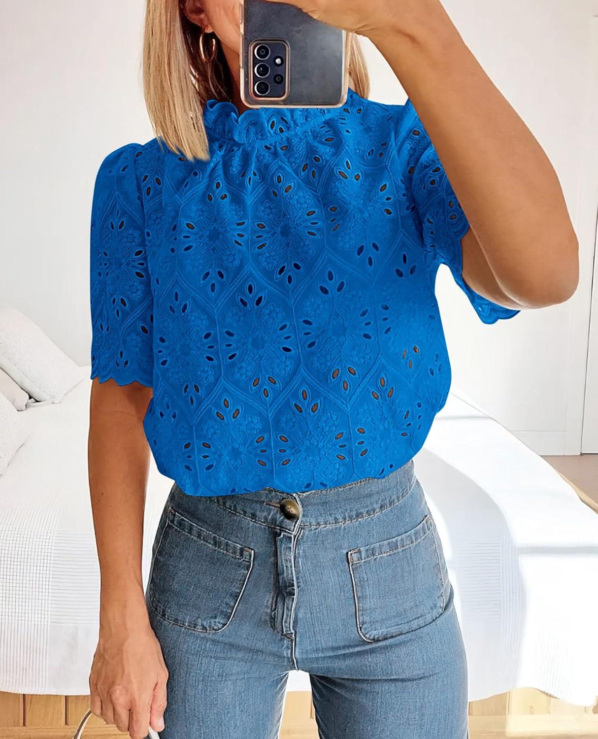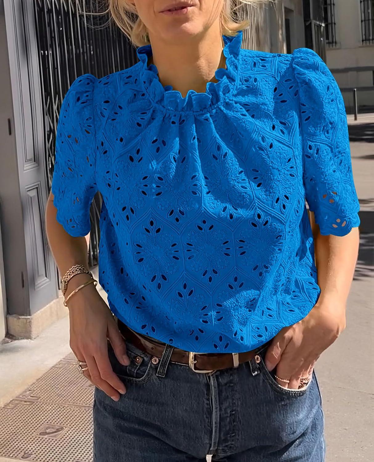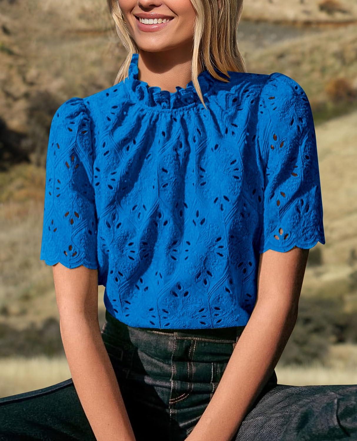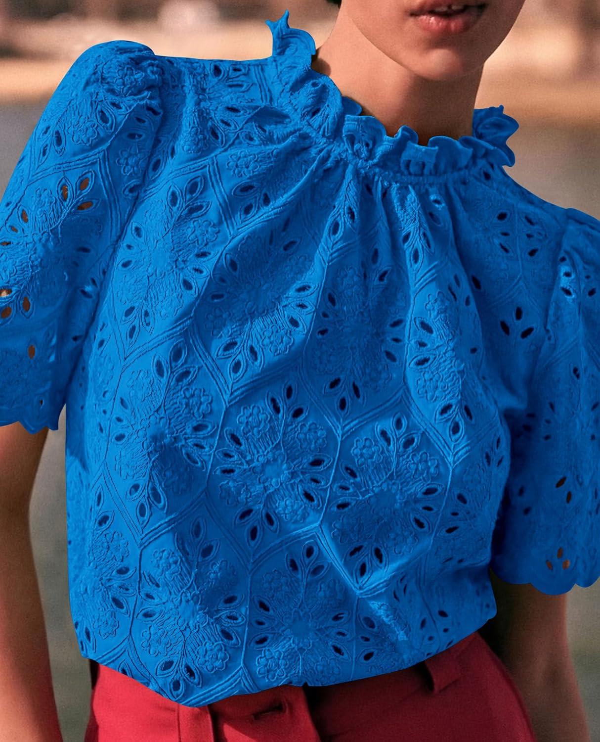PRETTYGARDEN Womens Summer Tops 2025 Trendy Short Sleeve Eyelet Embroidered Dressy Casual Blouse Shirts(Brilliant Blue)