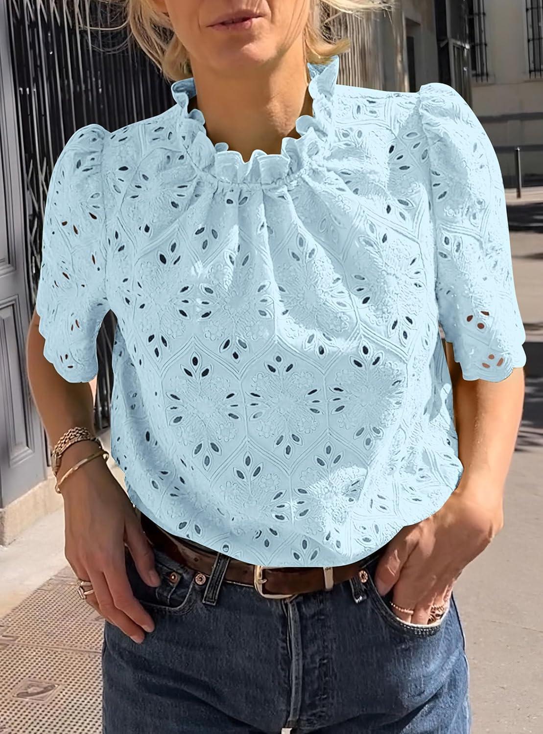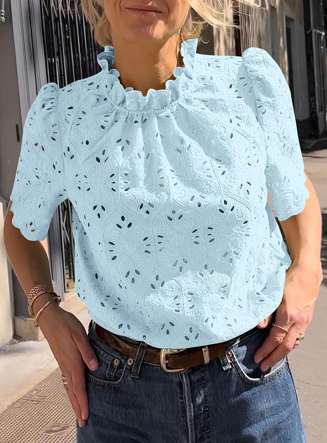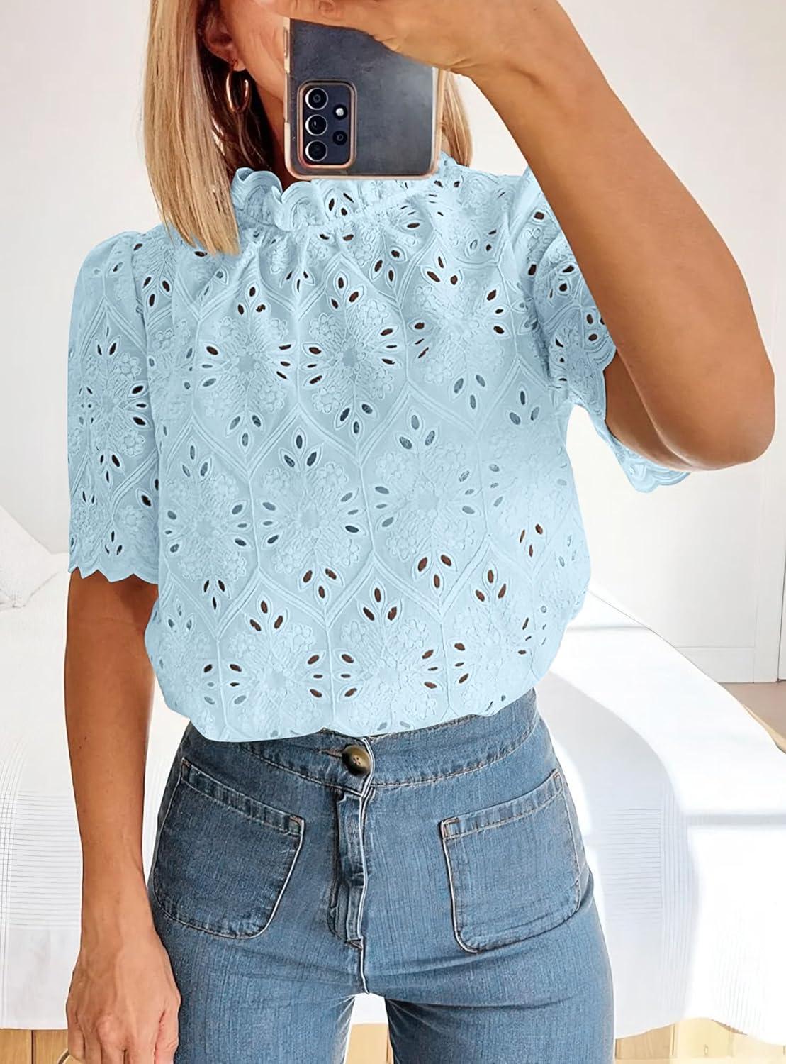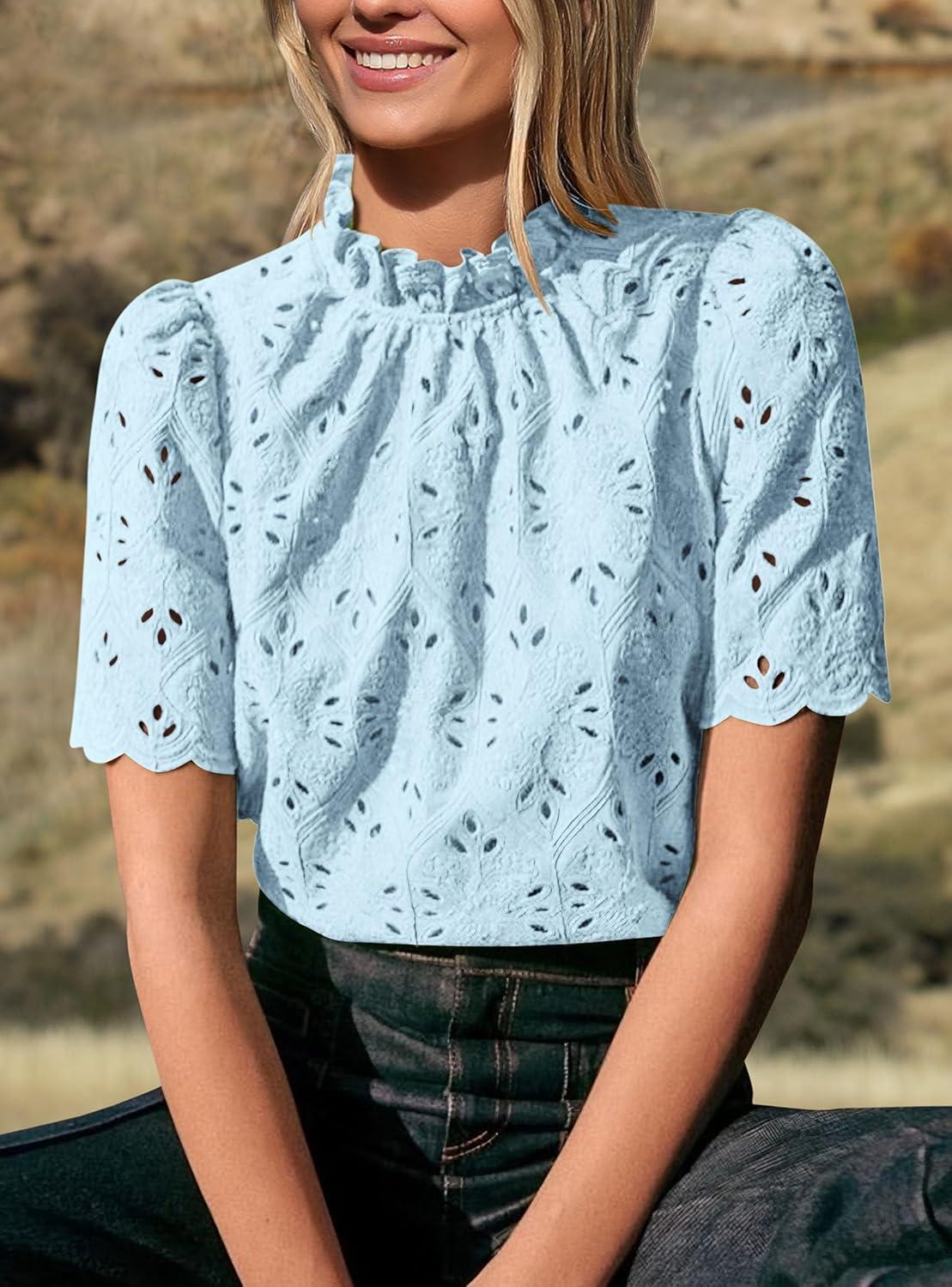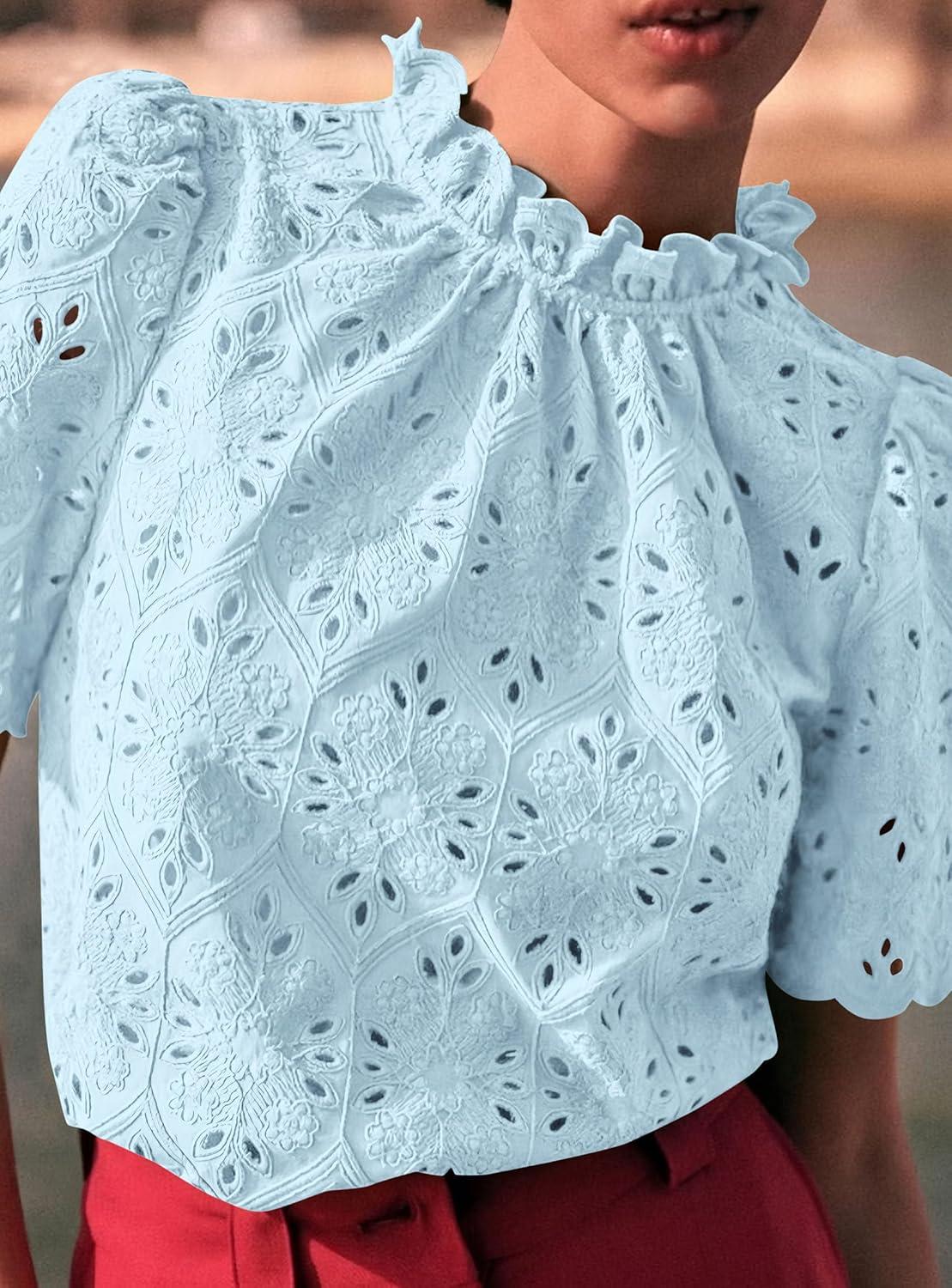 PRETTYGARDEN Womens Summer Tops 2025 Trendy Short Sleeve Eyelet Embroidered Dressy Casual Blouse Shirts(Light Blue)