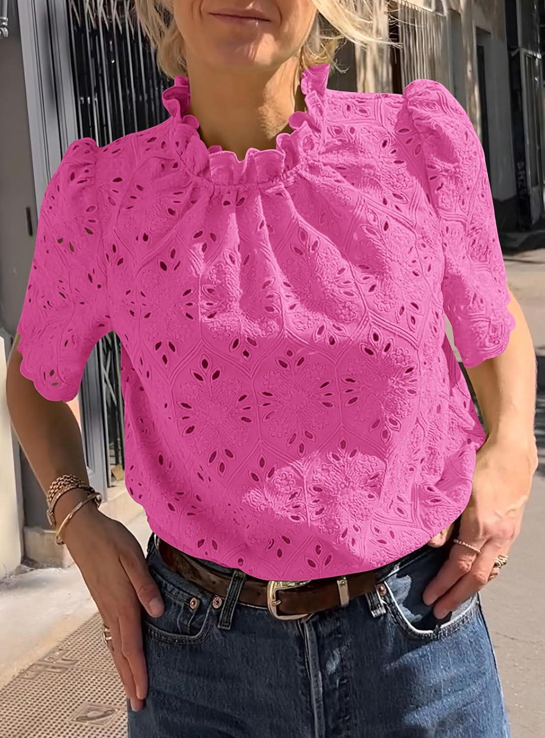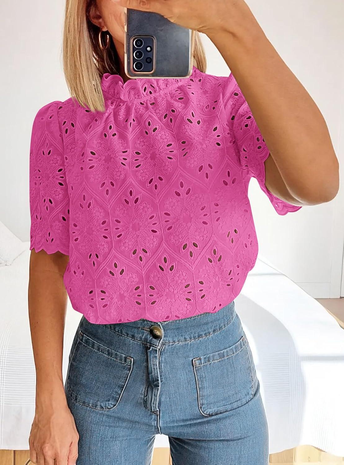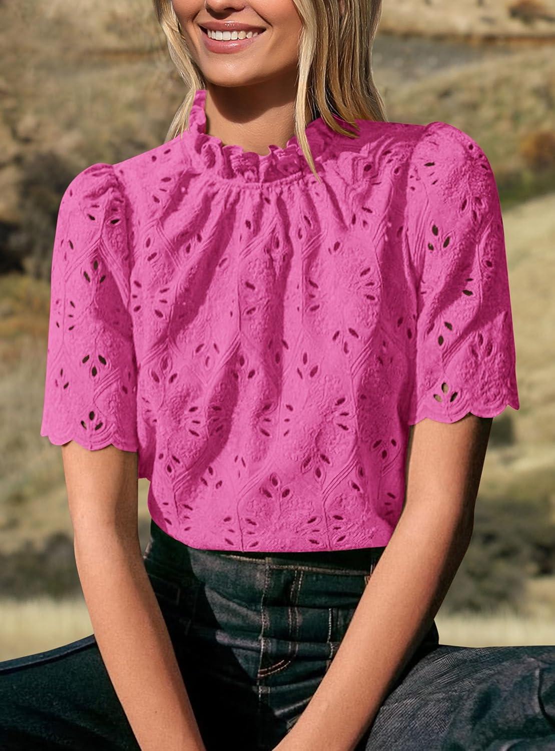 PRETTYGARDEN Womens Summer Tops 2025 Trendy Short Sleeve Eyelet Embroidered Dressy Casual Blouse Shirts(Pink)