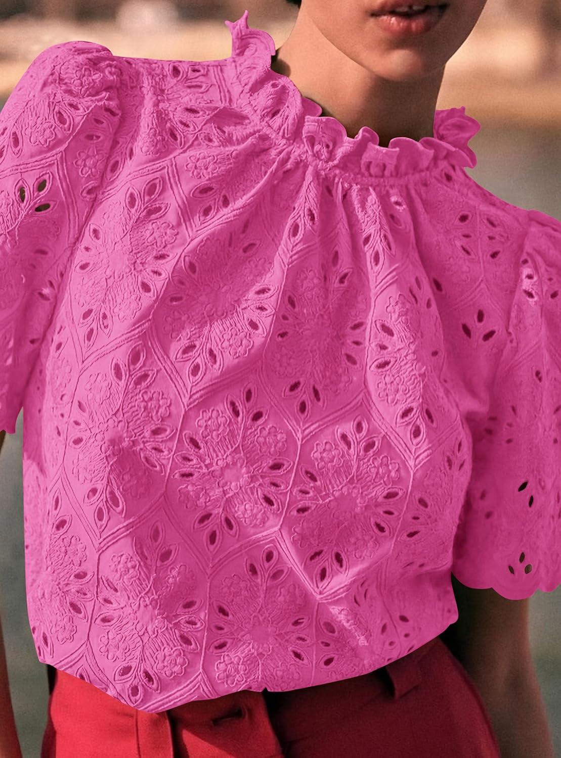 PRETTYGARDEN Womens Summer Tops 2025 Trendy Short Sleeve Eyelet Embroidered Dressy Casual Blouse Shirts(Rose Red)