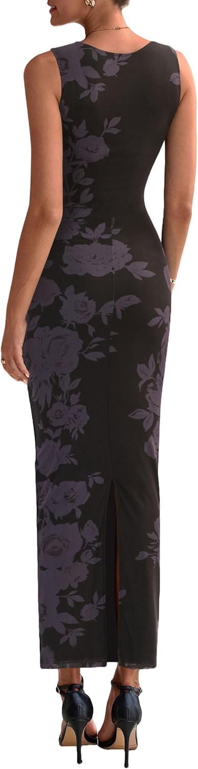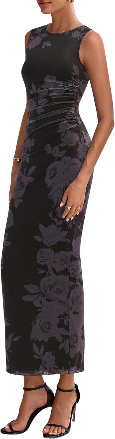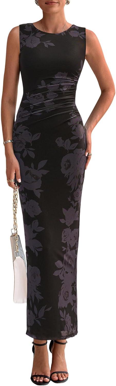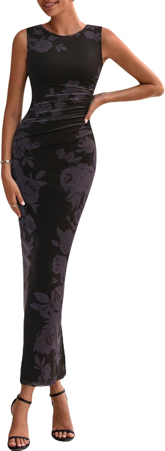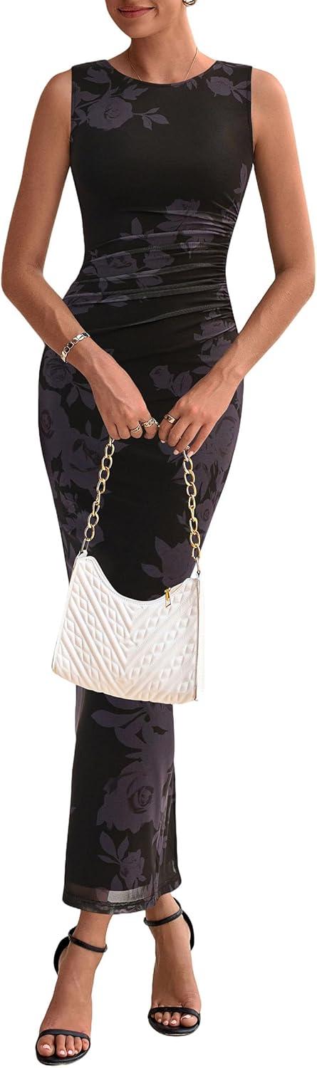 PRETTYGARDEN Womens Summer Wedding Guest Dress 2026 Spring Mesh Sleeveless Bodycon Ruched Floral Holiday Maxi Long Dresses(Floral Black)