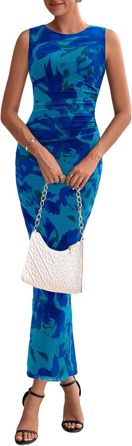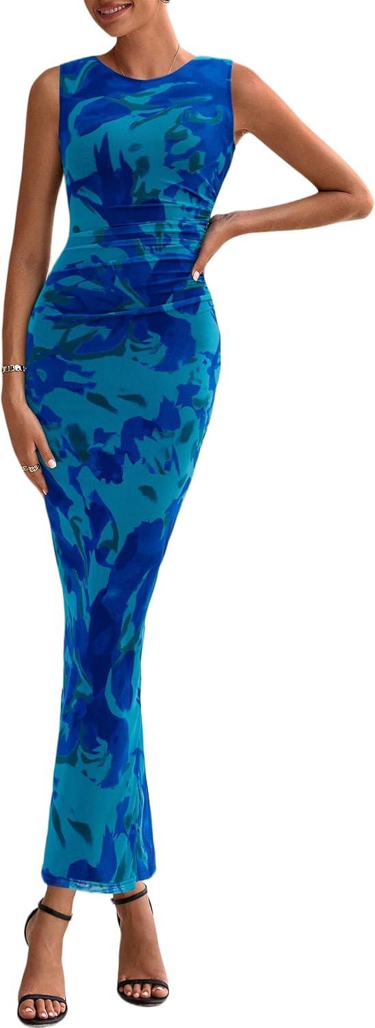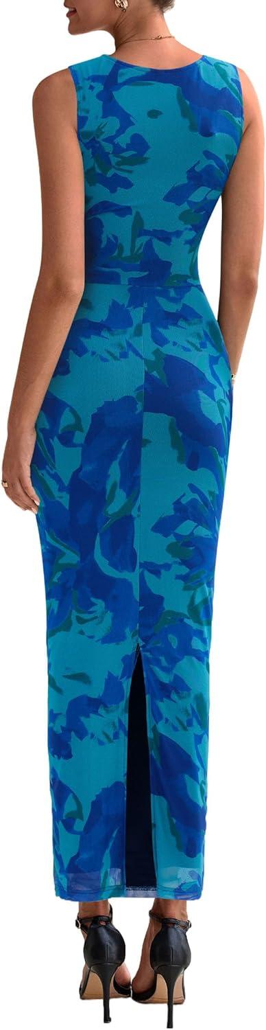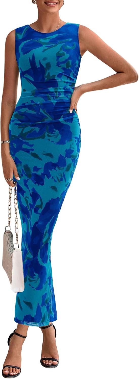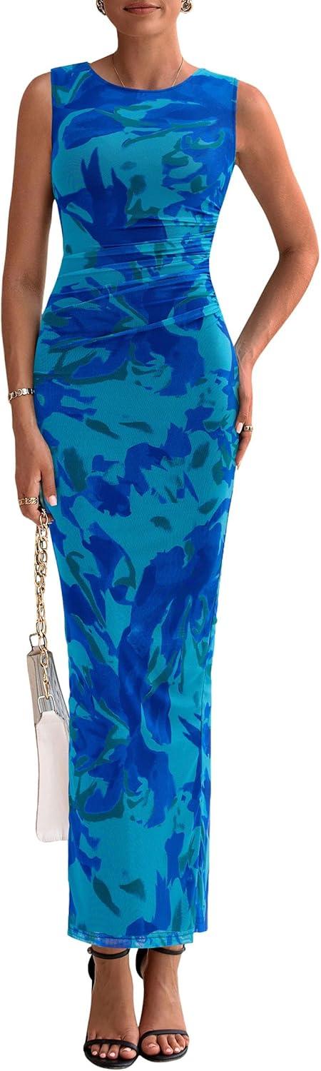 PRETTYGARDEN Womens Summer Wedding Guest Dress 2026 Spring Mesh Sleeveless Bodycon Ruched Floral Holiday Maxi Long Dresses(Green Blue Flower)