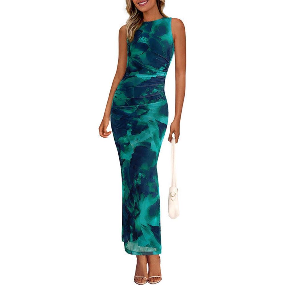 PRETTYGARDEN Womens Summer Wedding Guest Dress 2026 Spring Mesh Sleeveless Bodycon Ruched Floral Holiday Maxi Long Dresses(Green Floral)