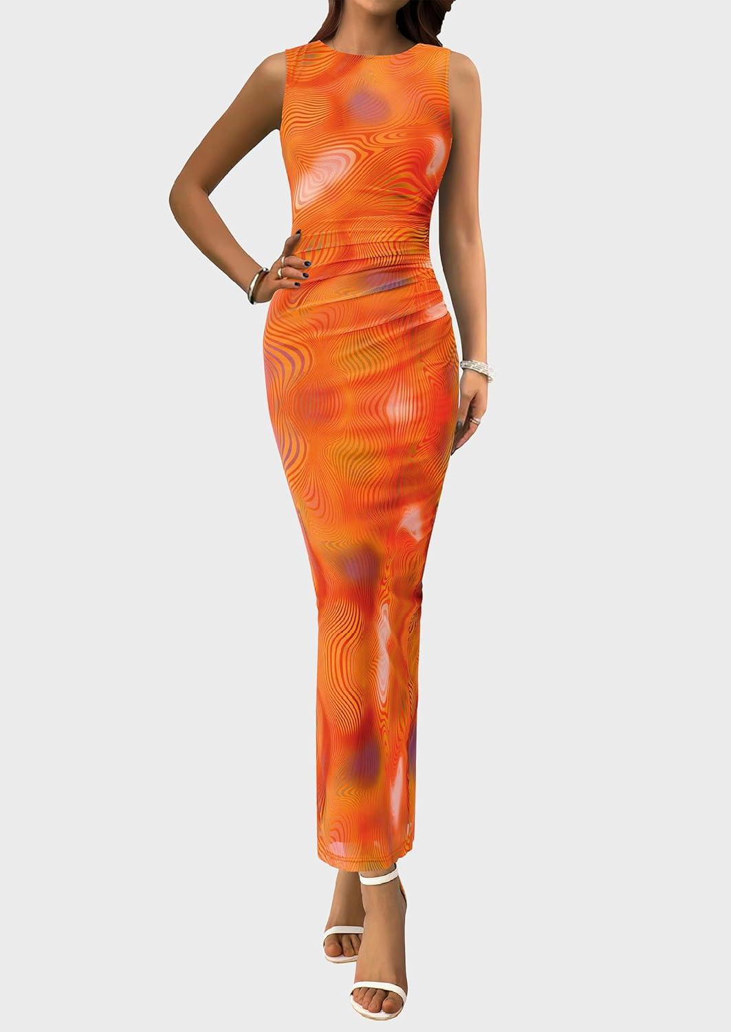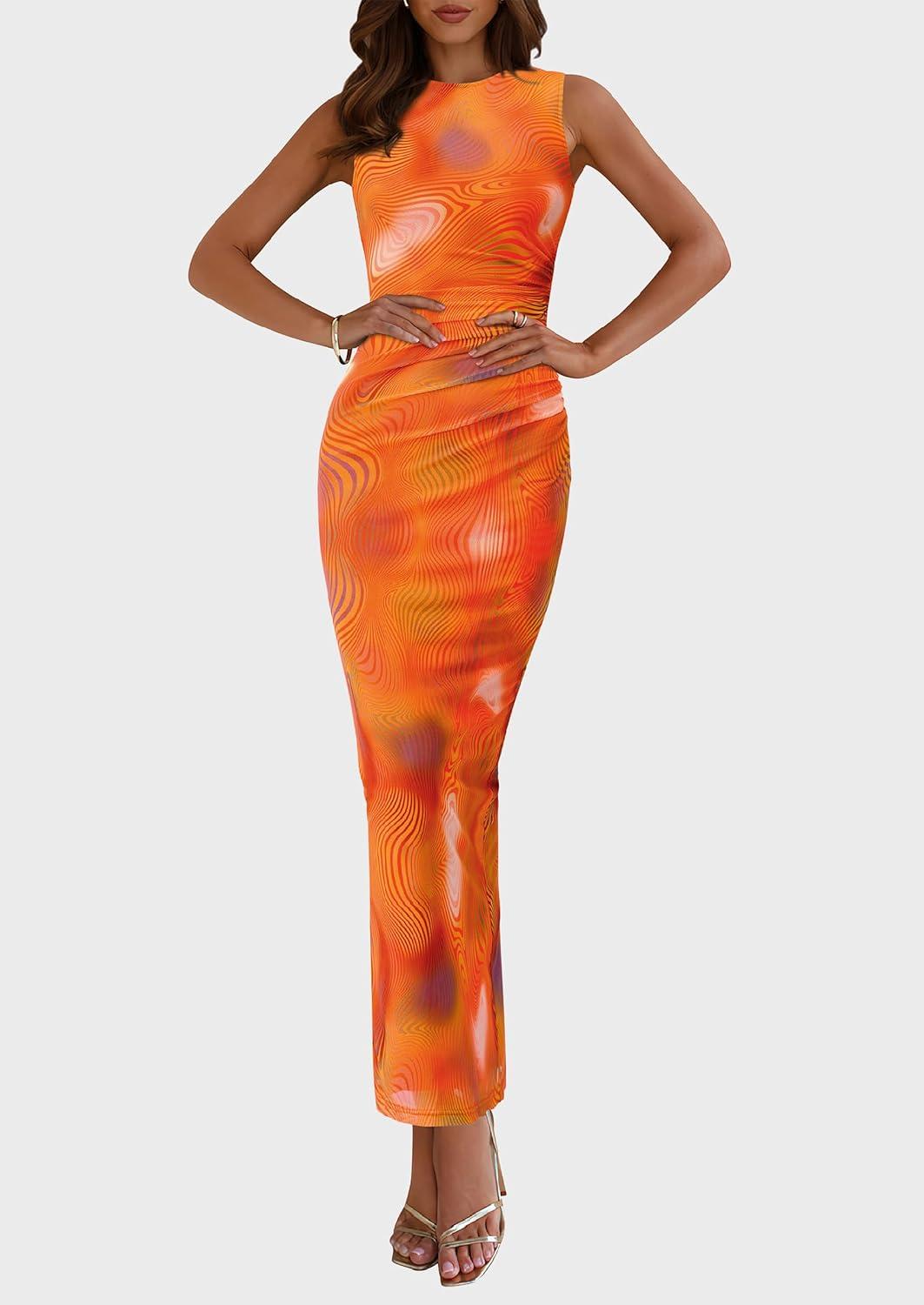 PRETTYGARDEN Womens Summer Wedding Guest Dress 2026 Spring Mesh Sleeveless Bodycon Ruched Floral Holiday Maxi Long Dresses(Print Orange)