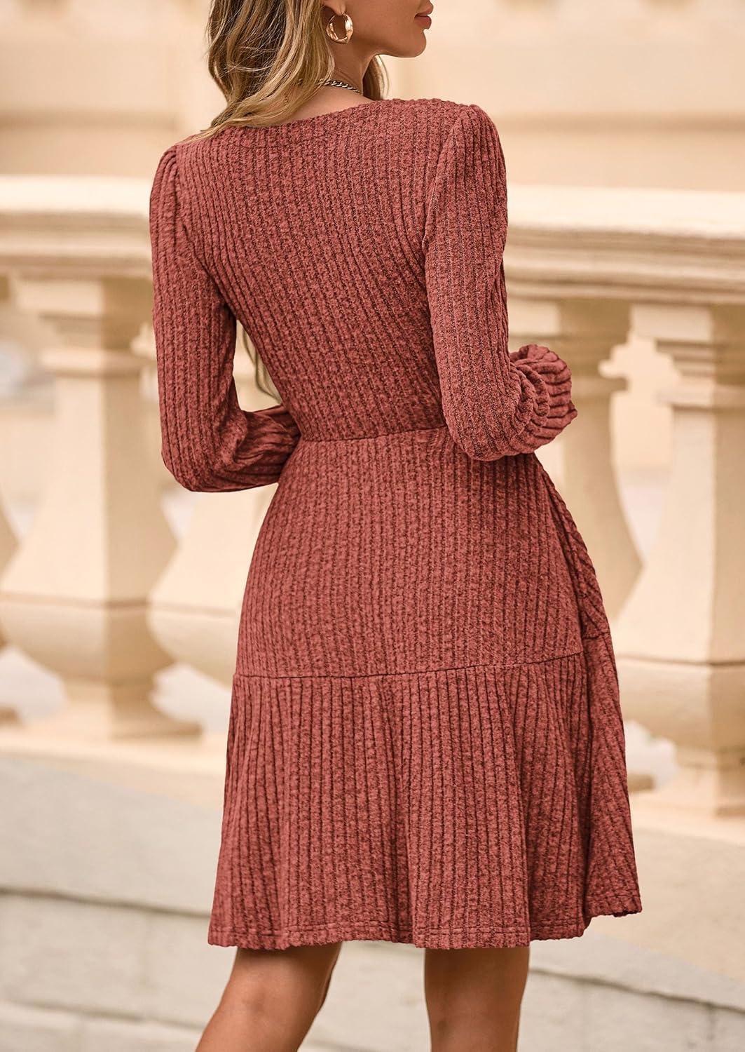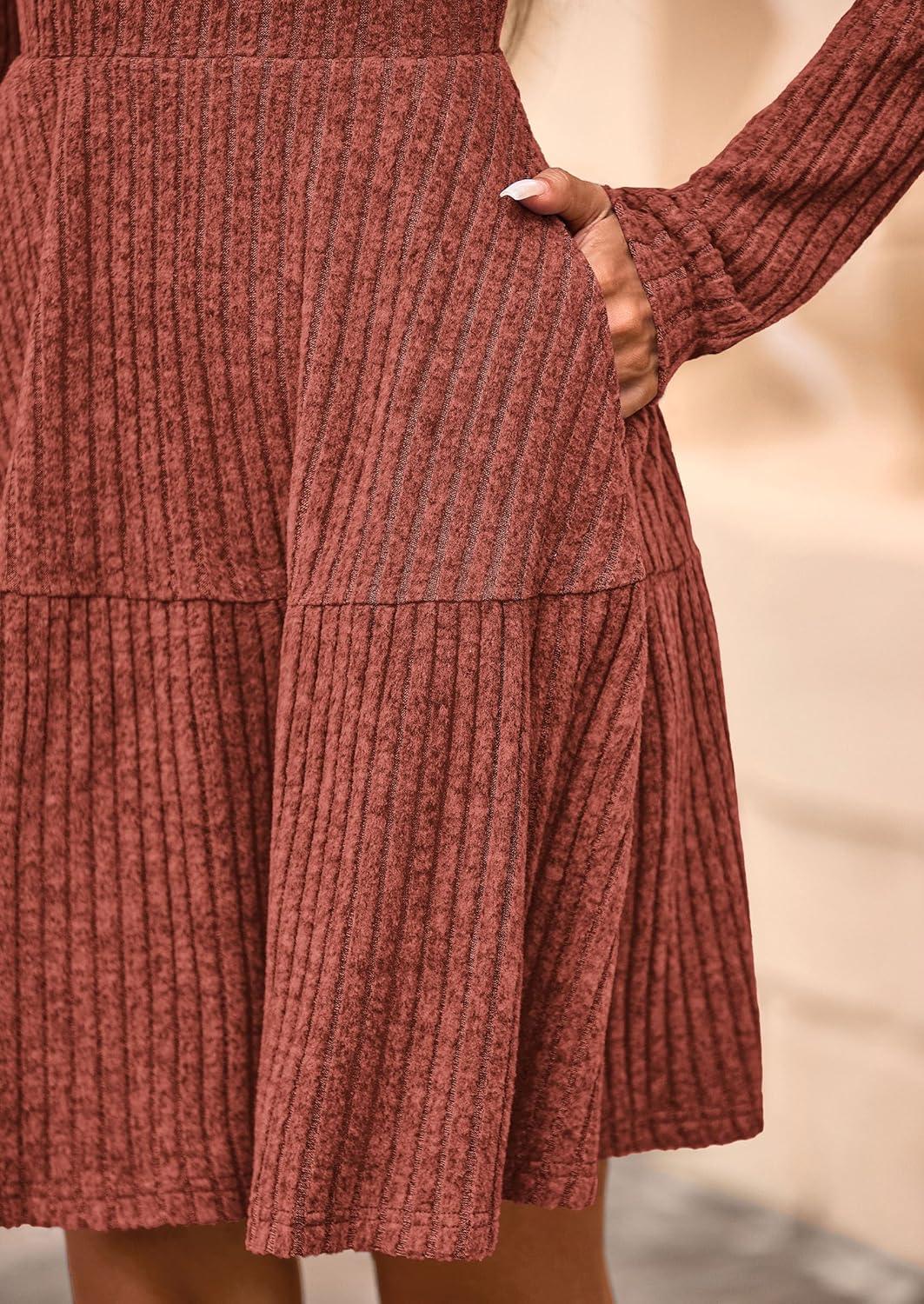 PRETTYGARDEN Womens Sweater Dress 2025 Fall Long Sleeve V Neck A Line Fit and Flare Ribbed Short Dresses Knit Outfits Pockets(Caramel)