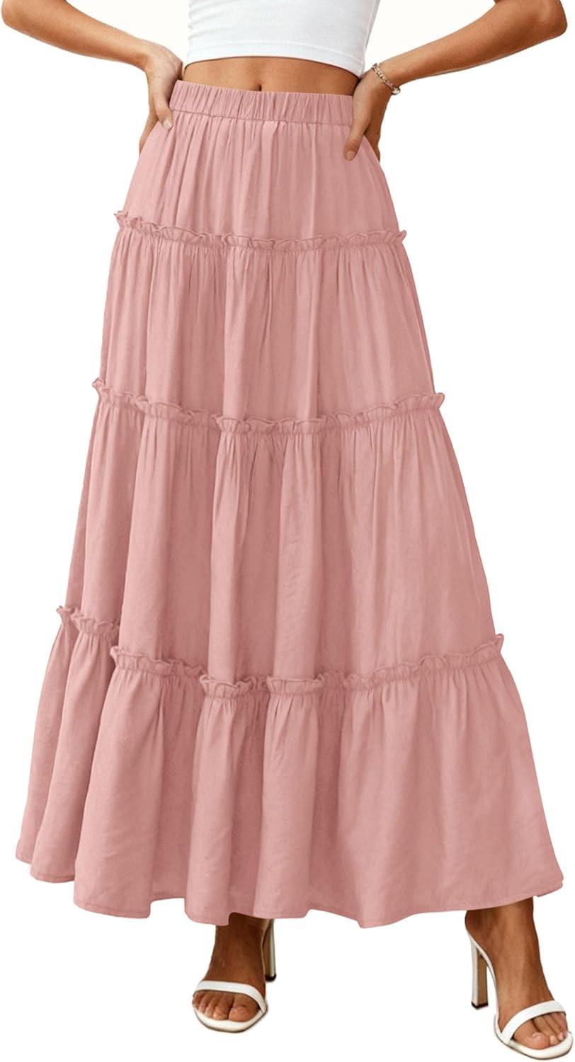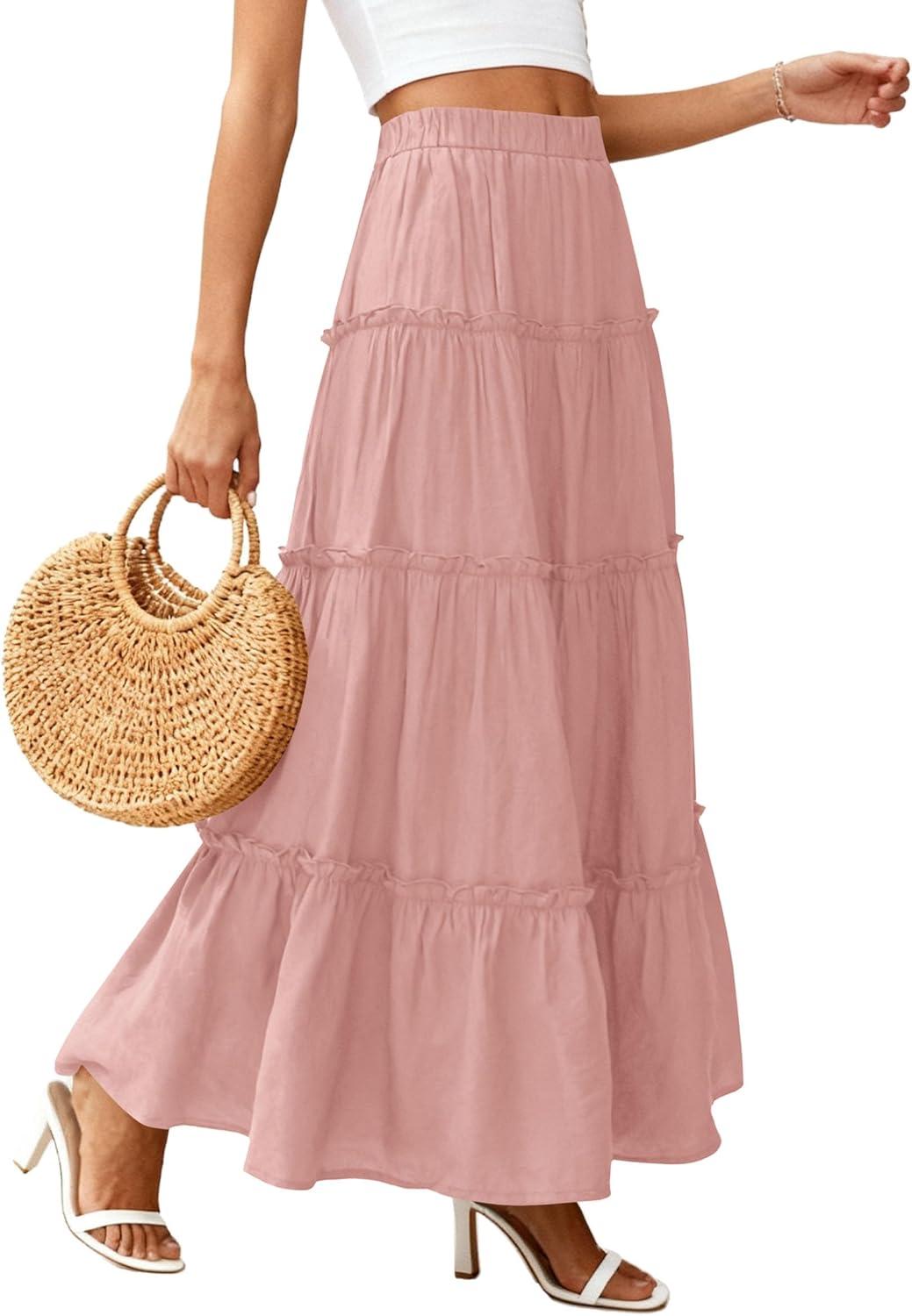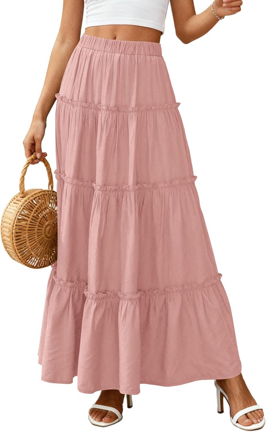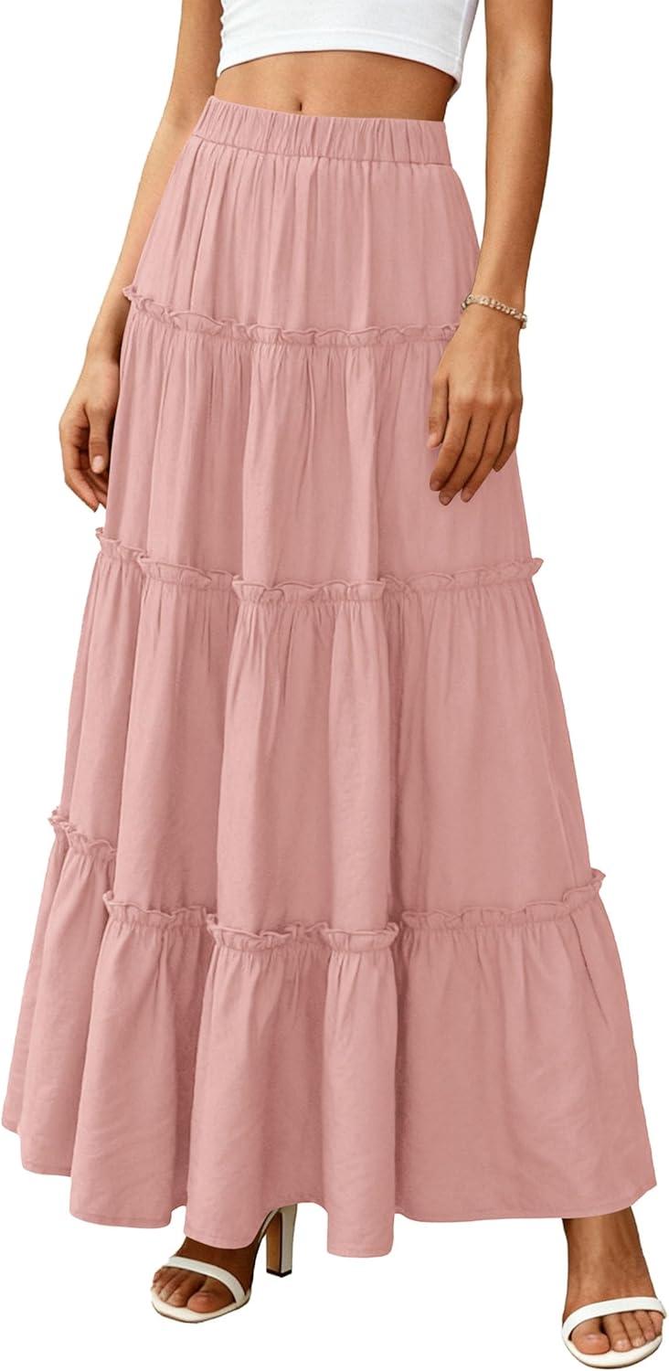 PRETTYGARDEN Women’s Tiered Maxi Skirt Summer Spring Fashion 2026 High Waisted Long Flowy Casual Boho Beach Vacation Clothes(Pink)