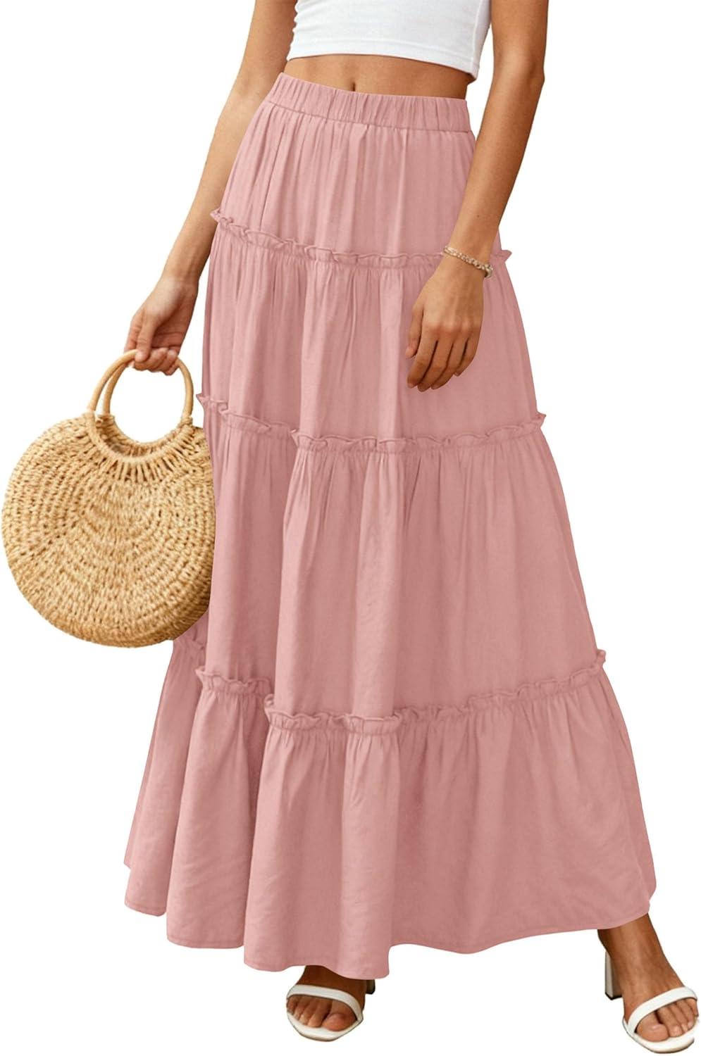 PRETTYGARDEN Women's Tiered Maxi Skirt Summer Spring Fashion 2026 High Waisted Long Flowy Casual Boho Beach Vacation Clothes(Pink)