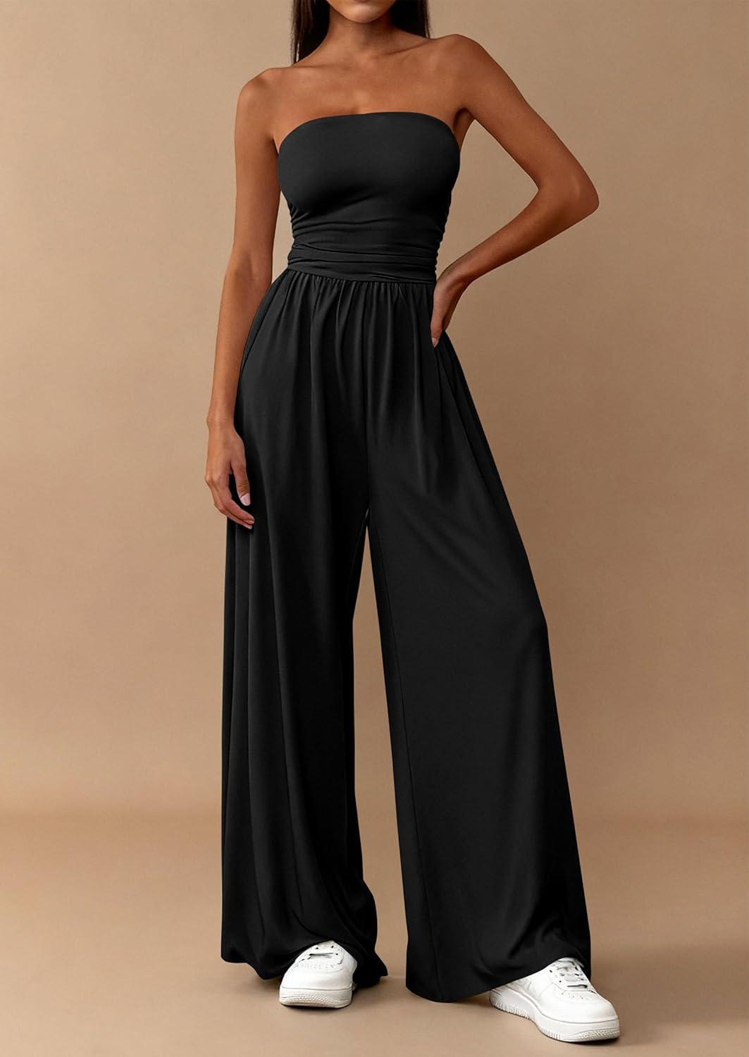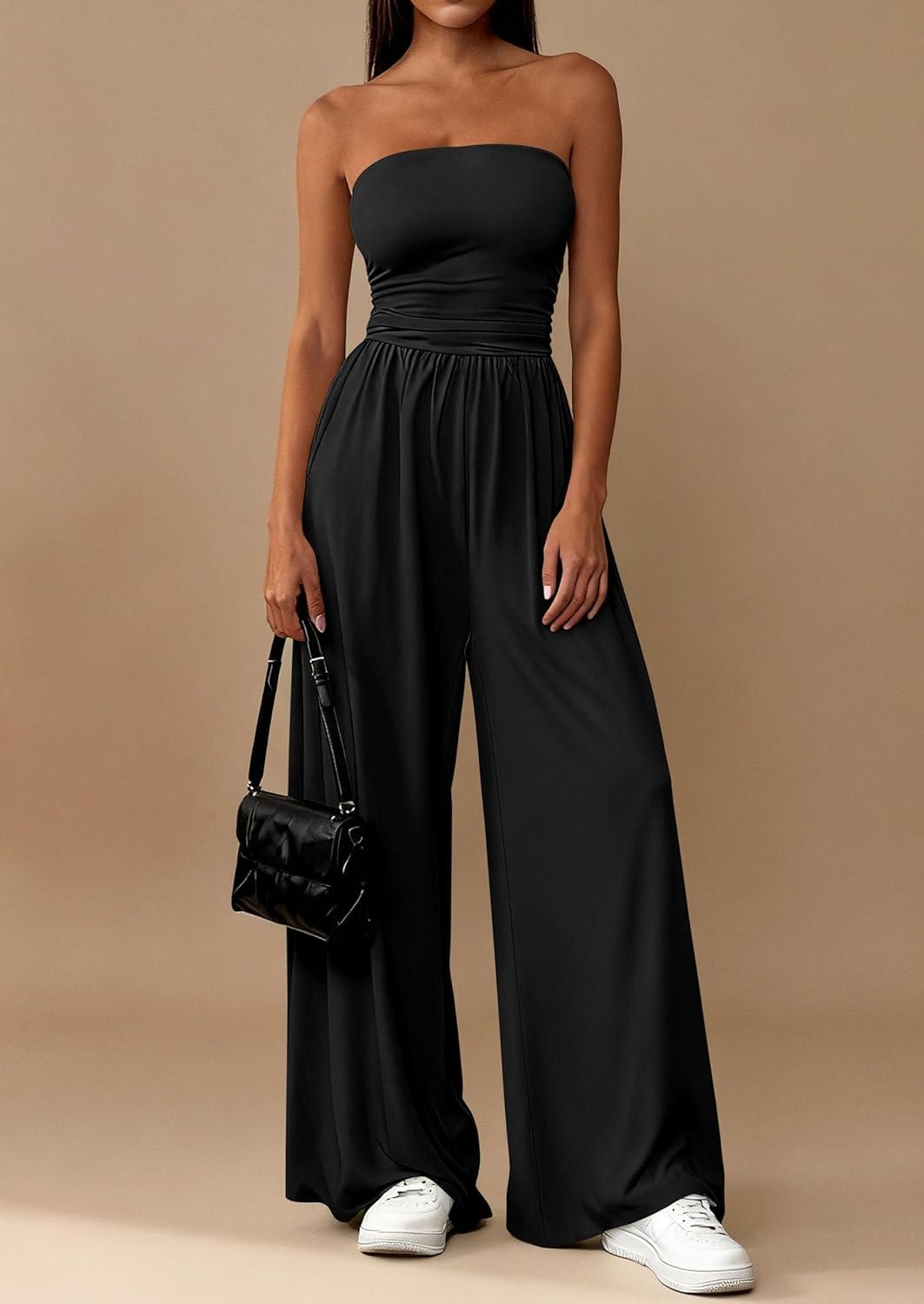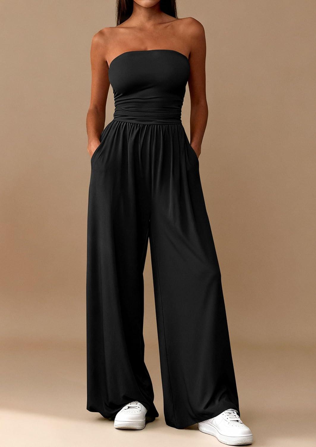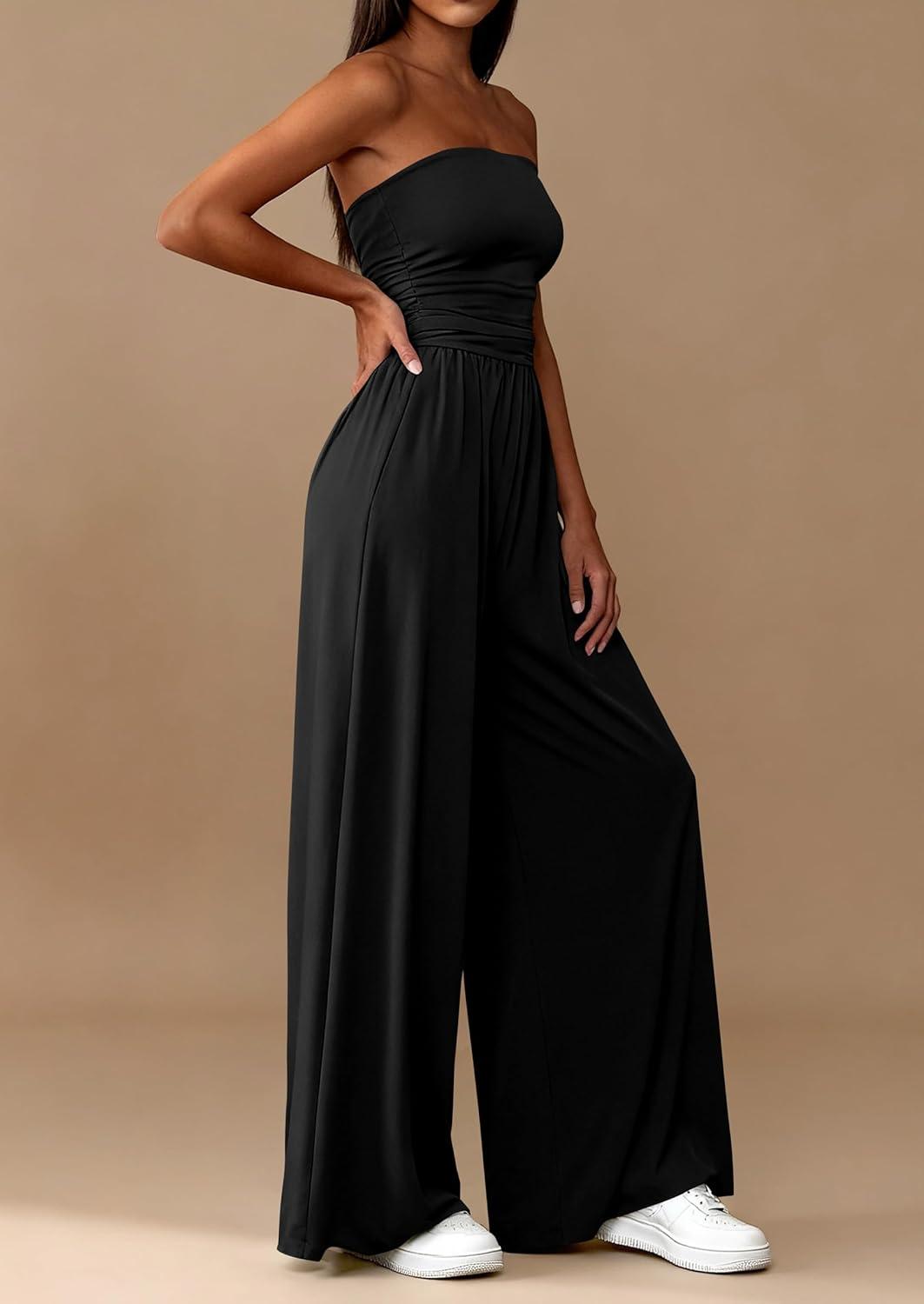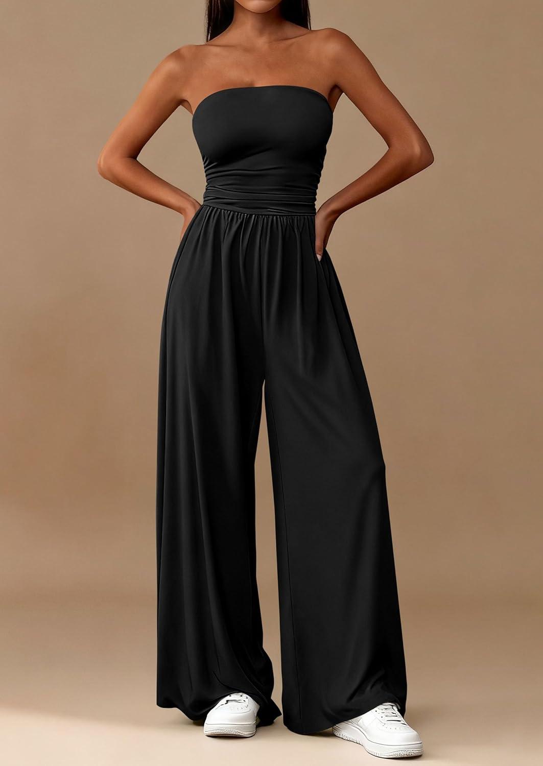 PRETTYGARDEN Womens Trendy Strapless Rompers 2026 Ruched Tube Top Wide Leg One Piece Jumpsuits Beach Vacation Summer Outfits(Black)