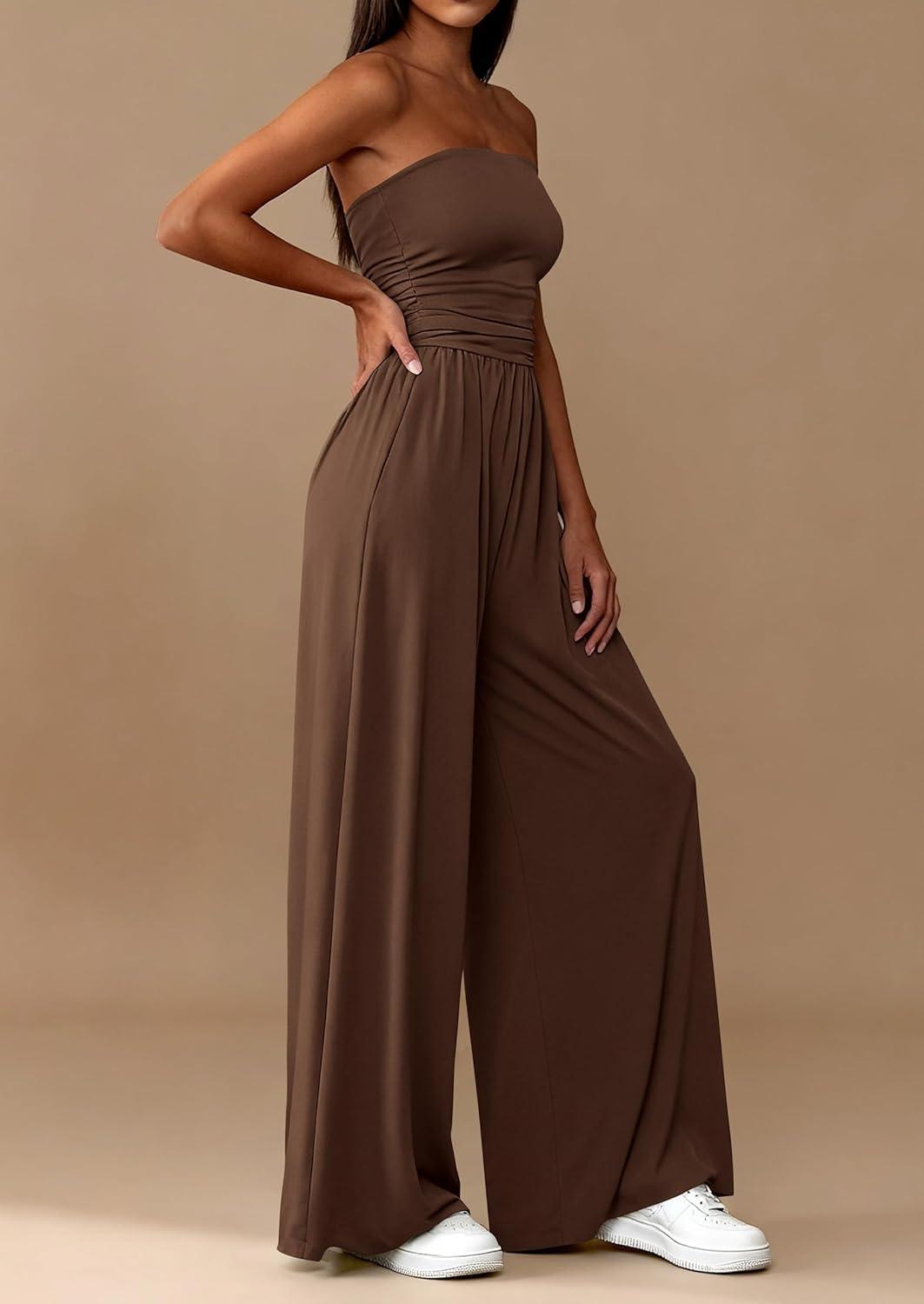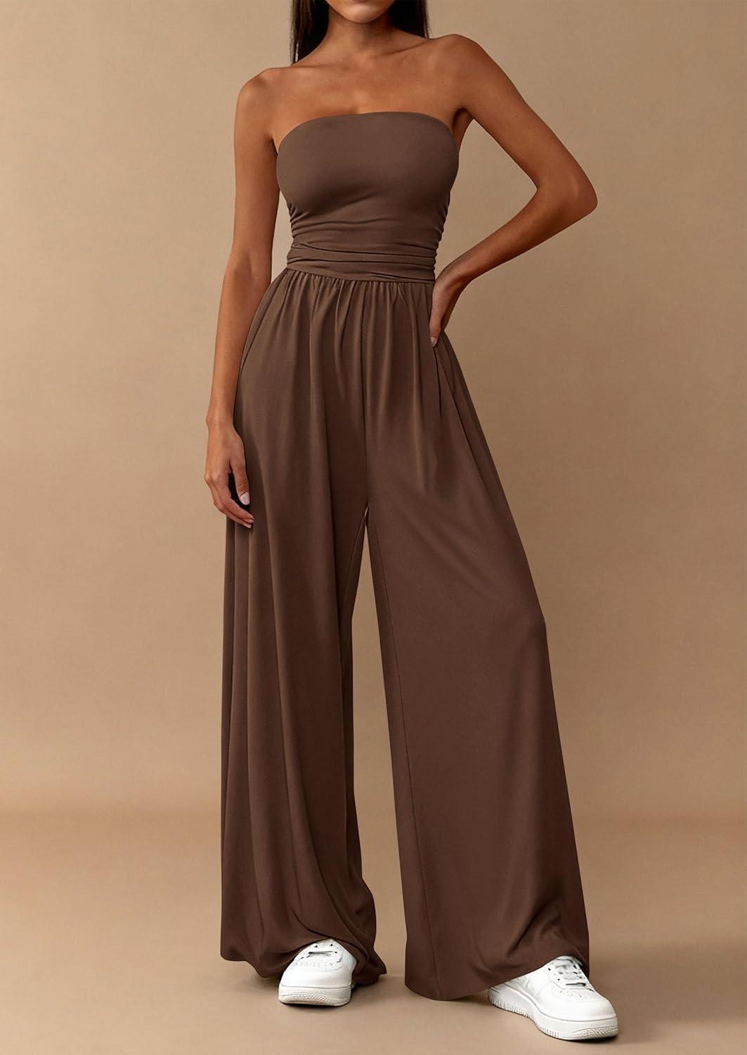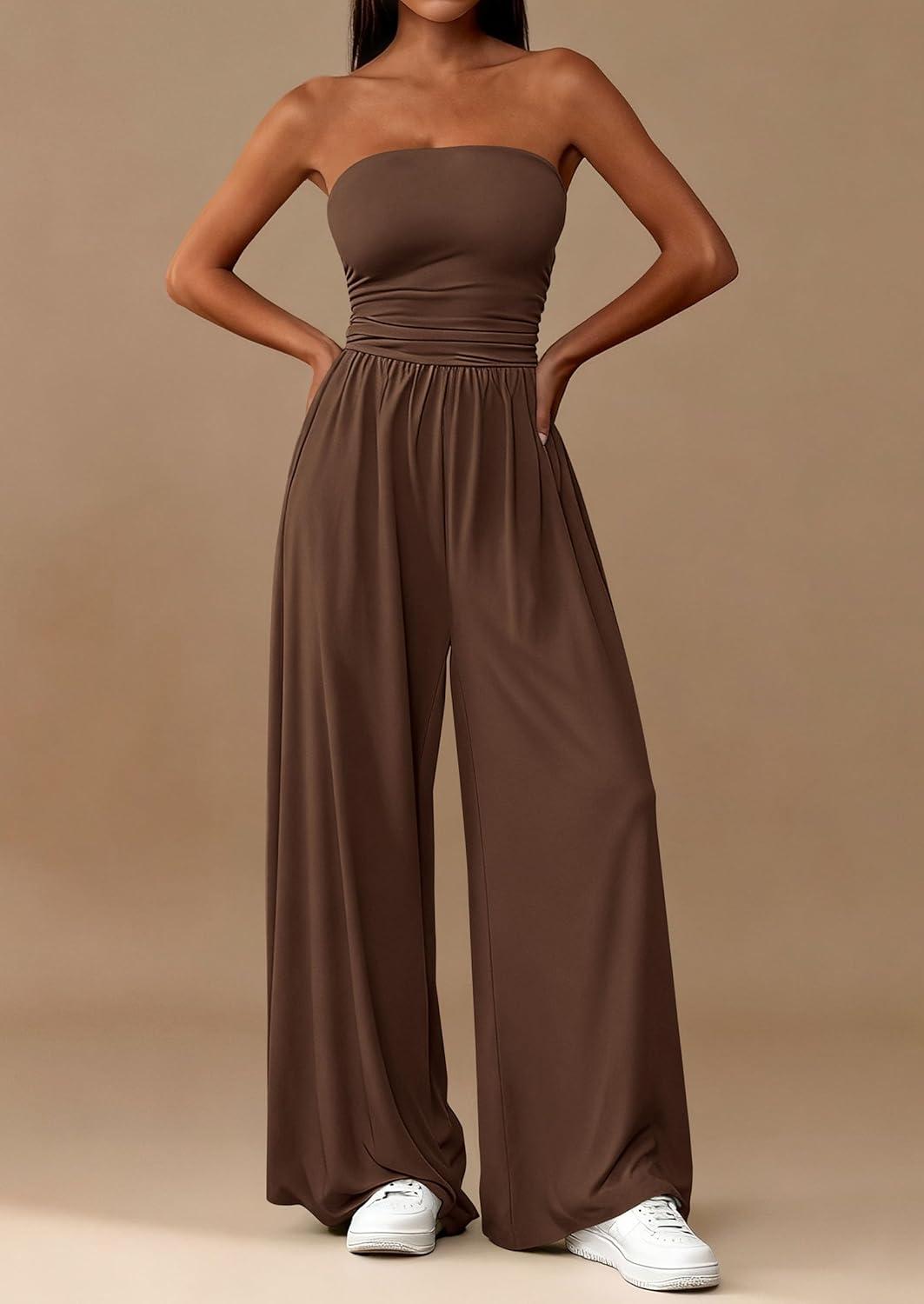 PRETTYGARDEN Womens Trendy Strapless Rompers 2026 Ruched Tube Top Wide Leg One Piece Jumpsuits Beach Vacation Summer Outfits(Brown)