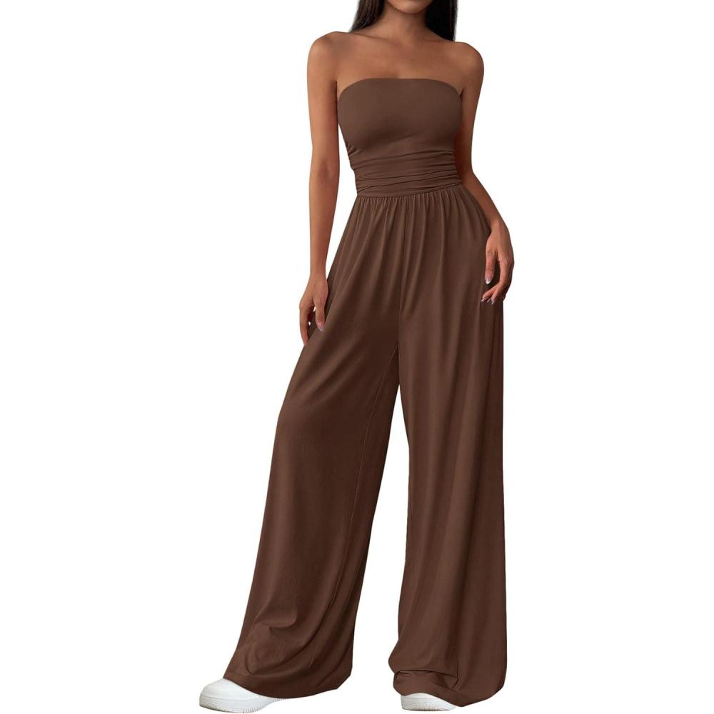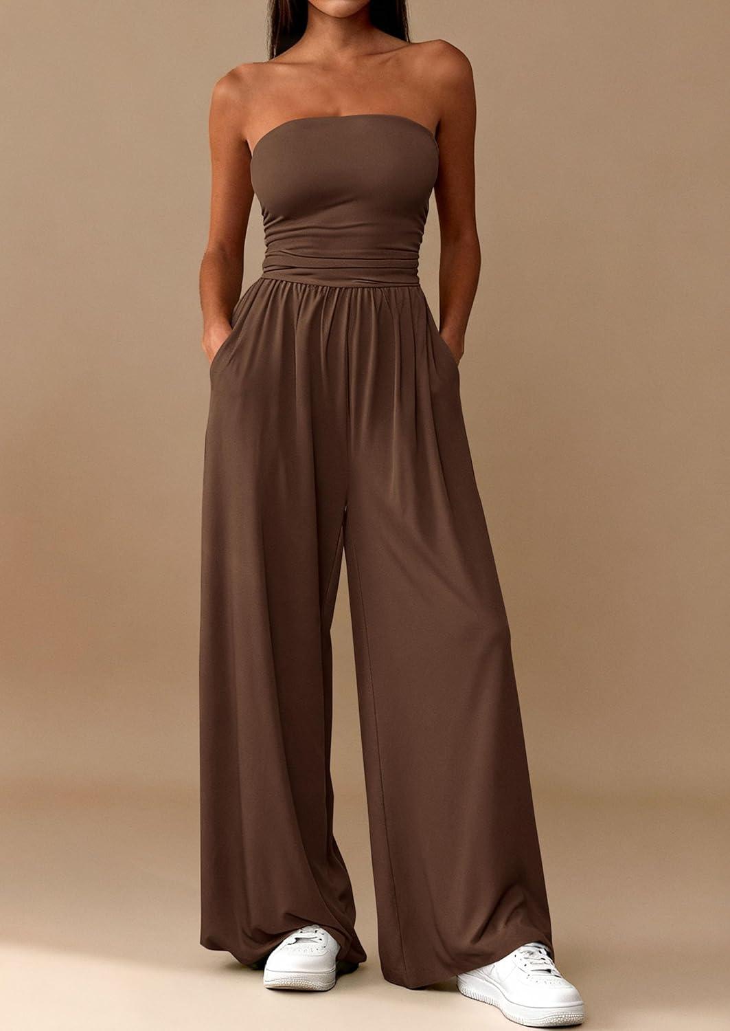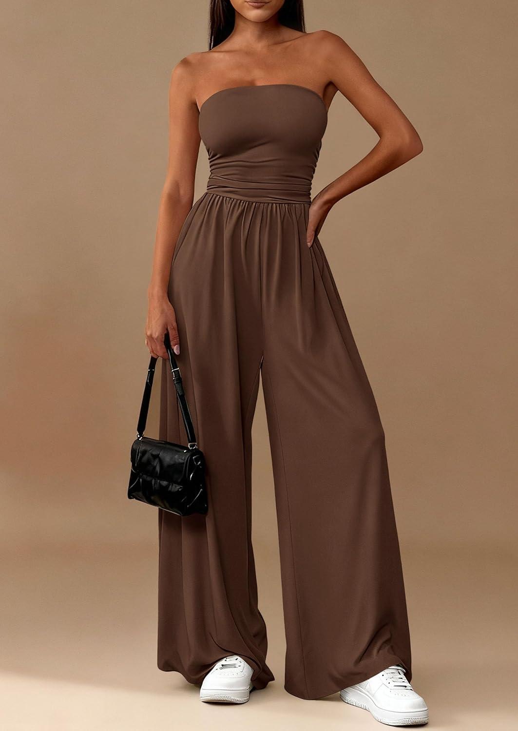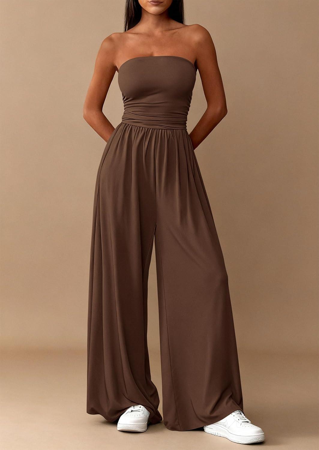 PRETTYGARDEN Womens Trendy Strapless Rompers 2026 Ruched Tube Top Wide Leg One Piece Jumpsuits Beach Vacation Summer Outfits(Brown)