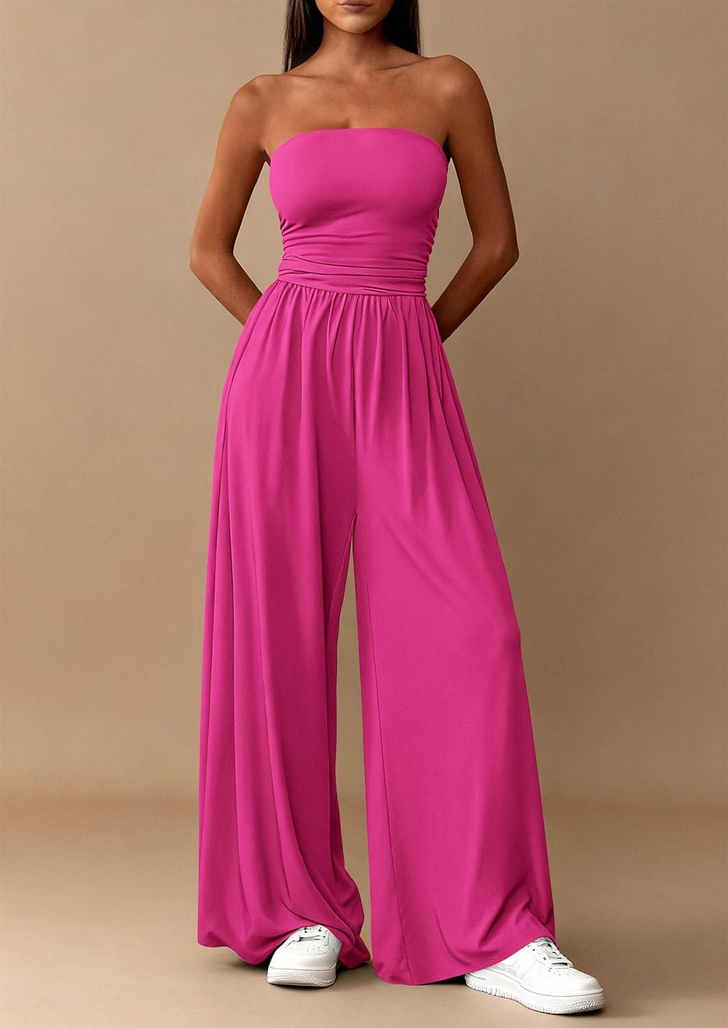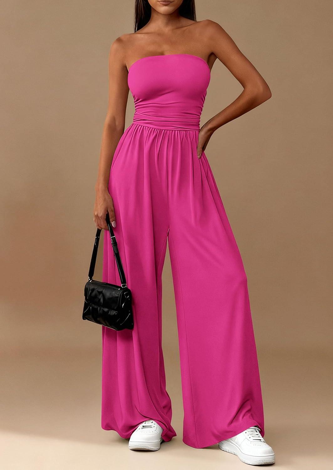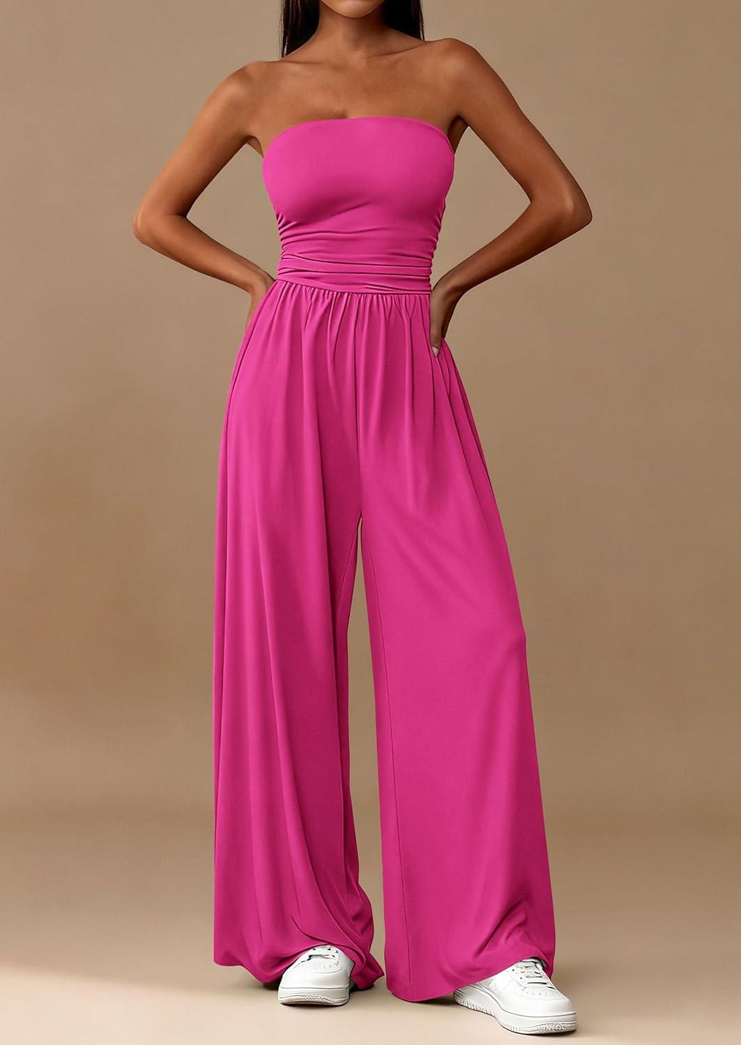PRETTYGARDEN Womens Trendy Strapless Rompers 2026 Ruched Tube Top Wide Leg One Piece Jumpsuits Beach Vacation Summer Outfits(Rose Red)