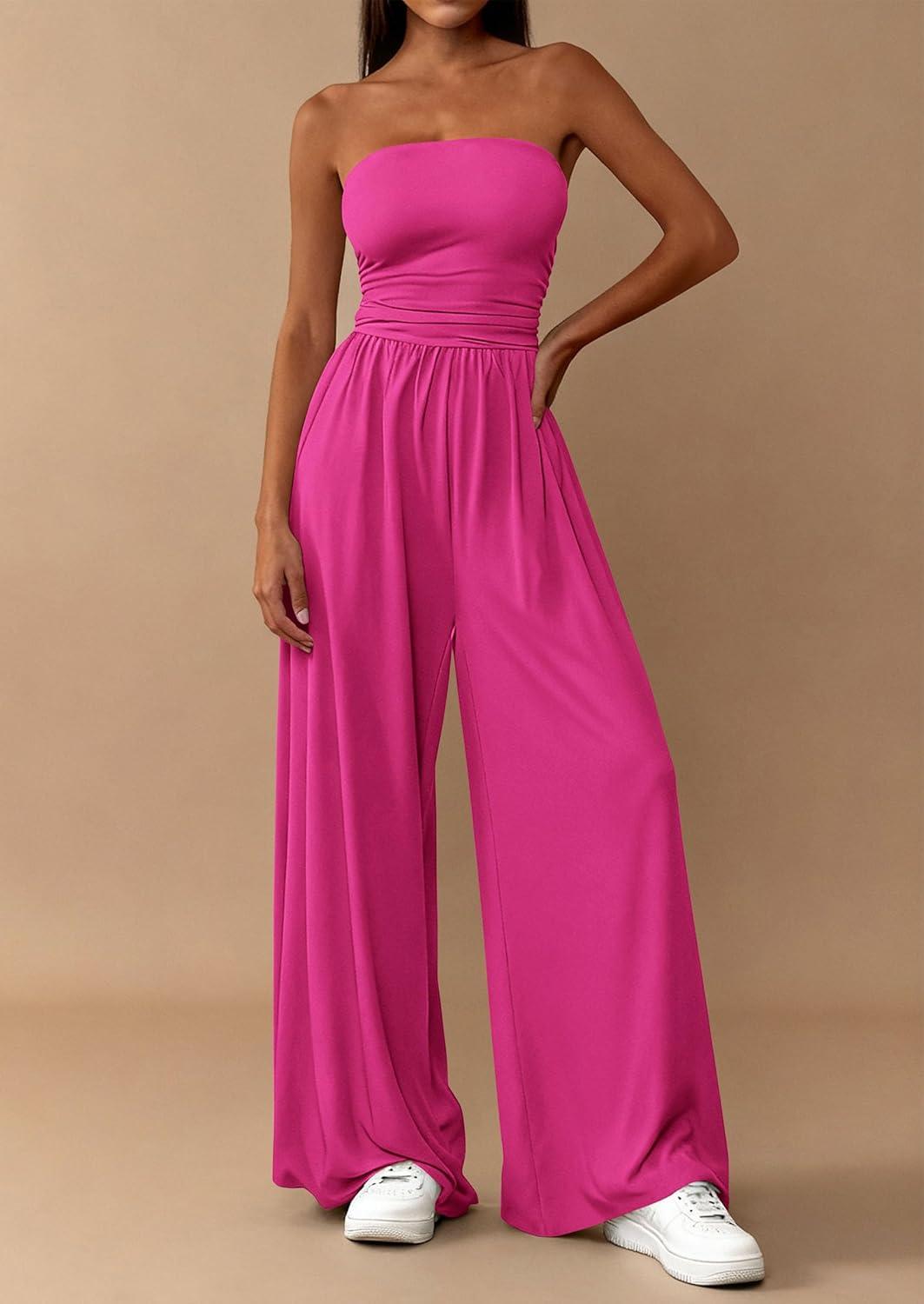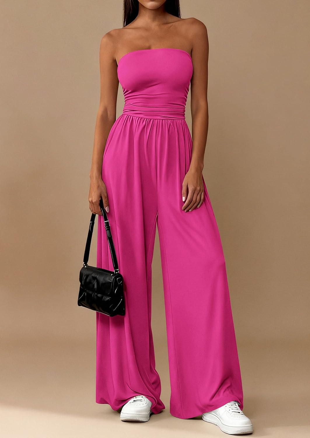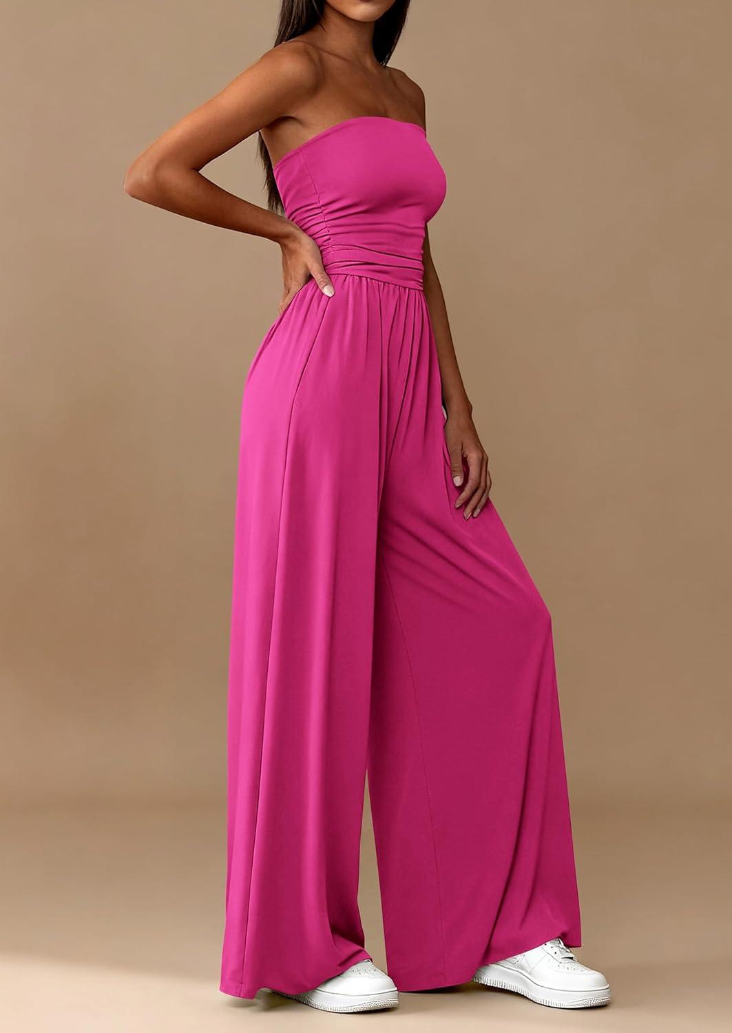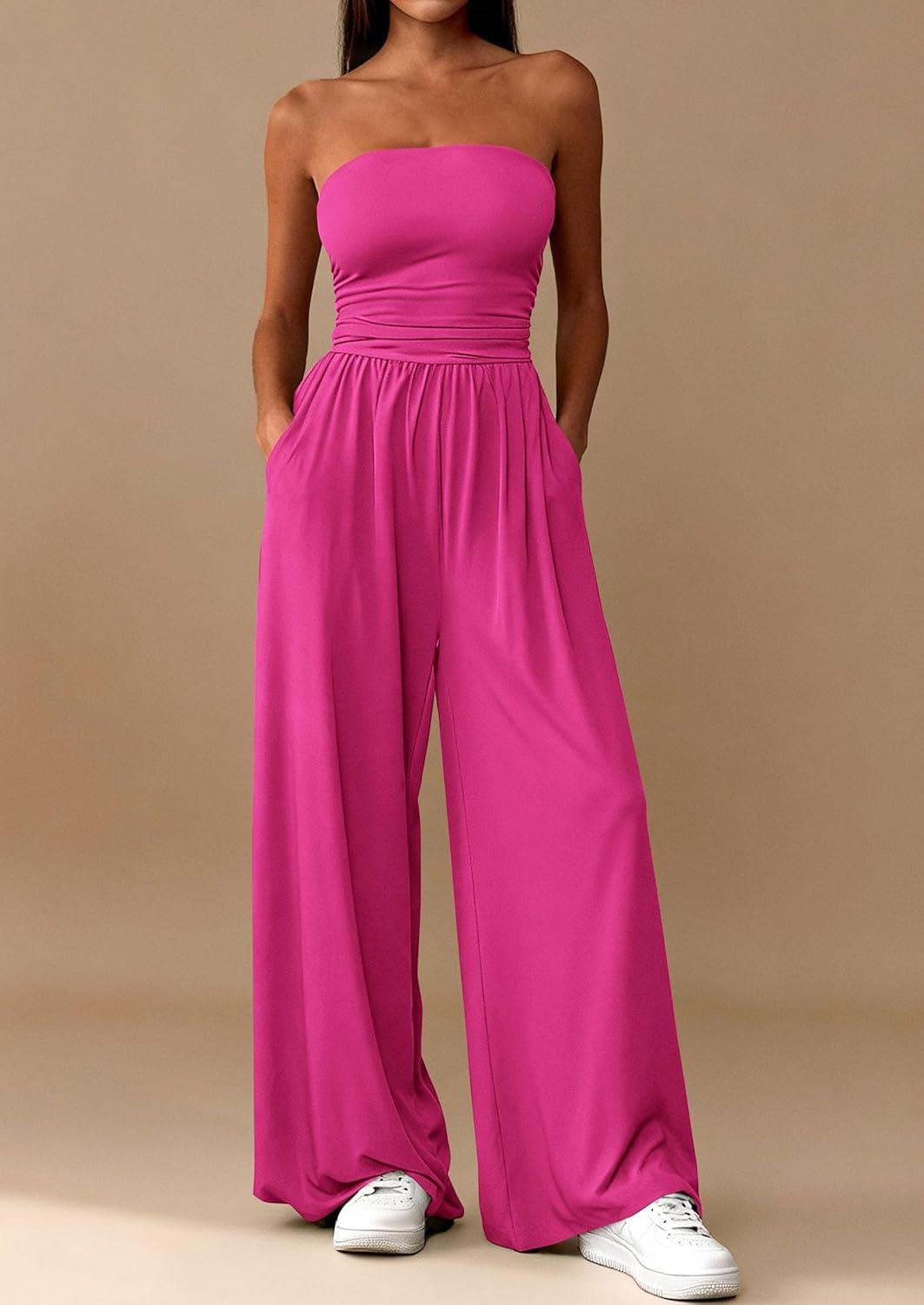 PRETTYGARDEN Womens Trendy Strapless Rompers 2026 Ruched Tube Top Wide Leg One Piece Jumpsuits Beach Vacation Summer Outfits(Rose Red)