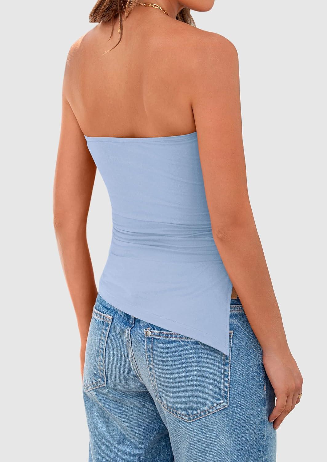 PRETTYGARDEN Womens Tube Top 2025 Summer Trendy Strapless Tops Going Out Outfits Ruched Asymmetrical Bandeau Shirts(Light Blue)