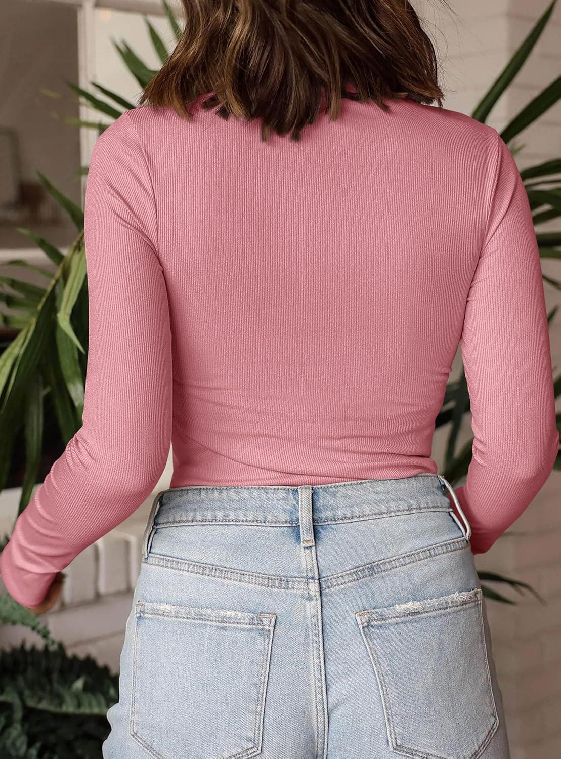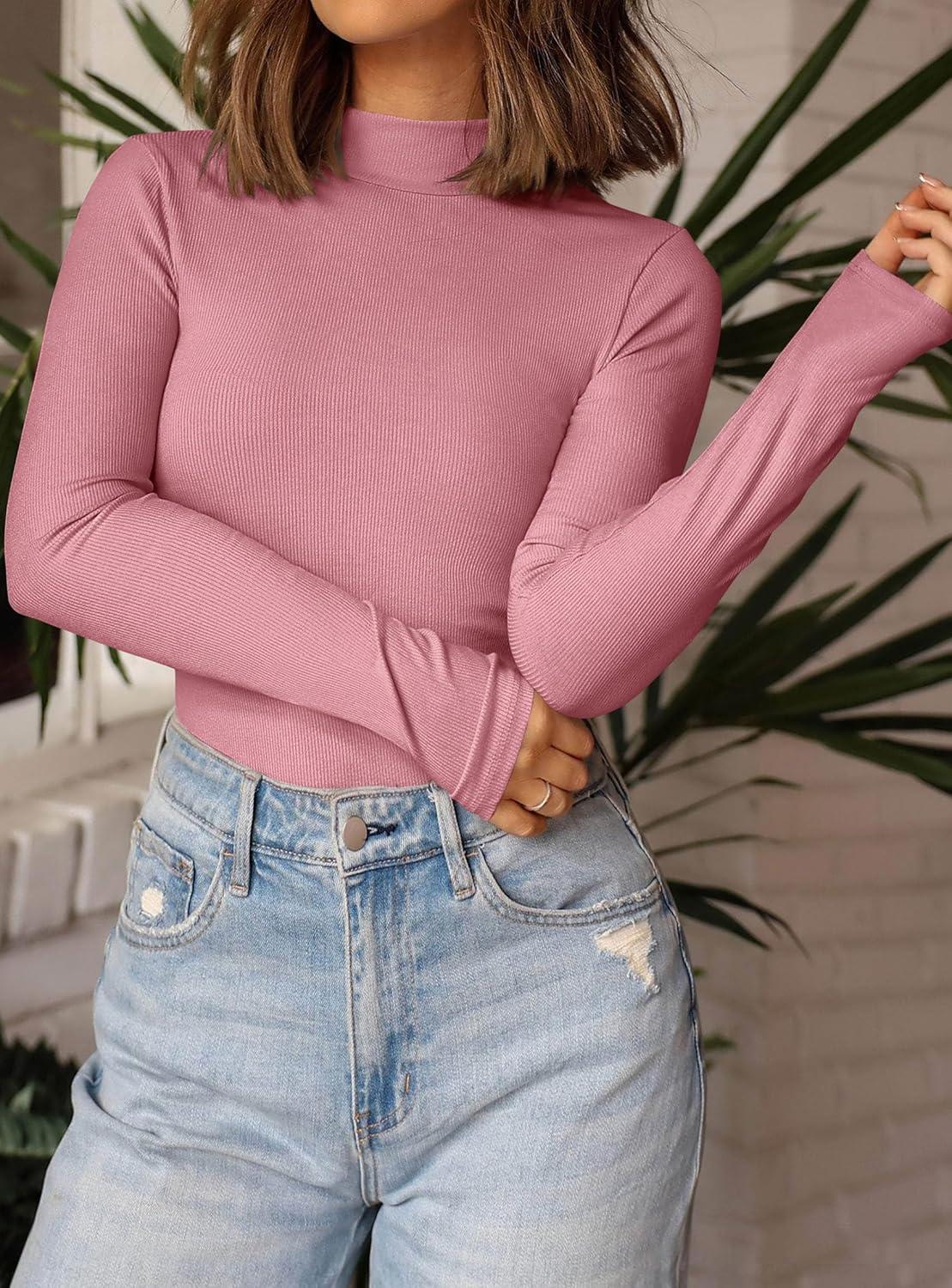 PRETTYGARDEN Women's Turtleneck Long Sleeve Shirts 2025 Fall Basic Tees Ribbed Fitted Tops Thermal Layering Knit Top Clothes(Pink)