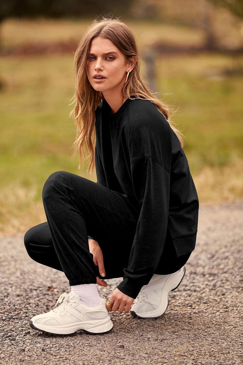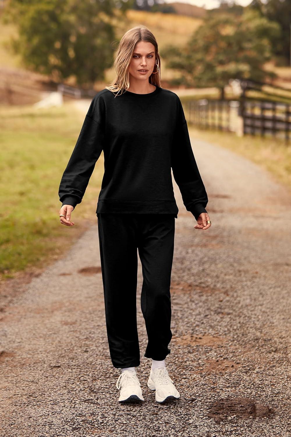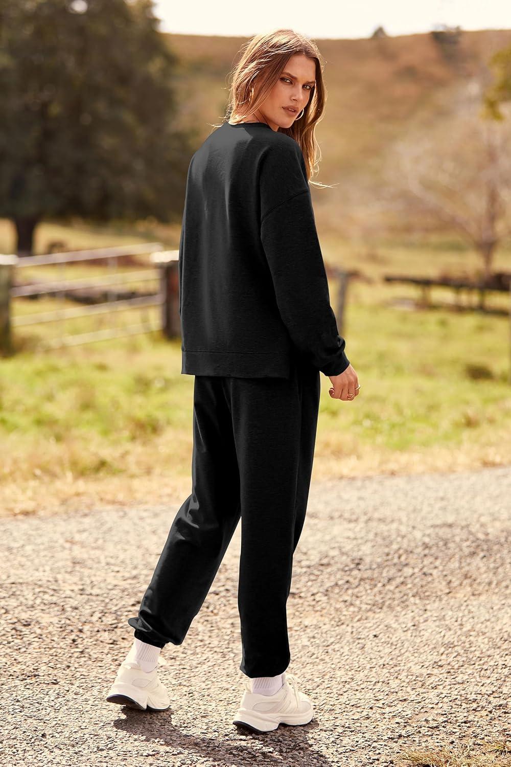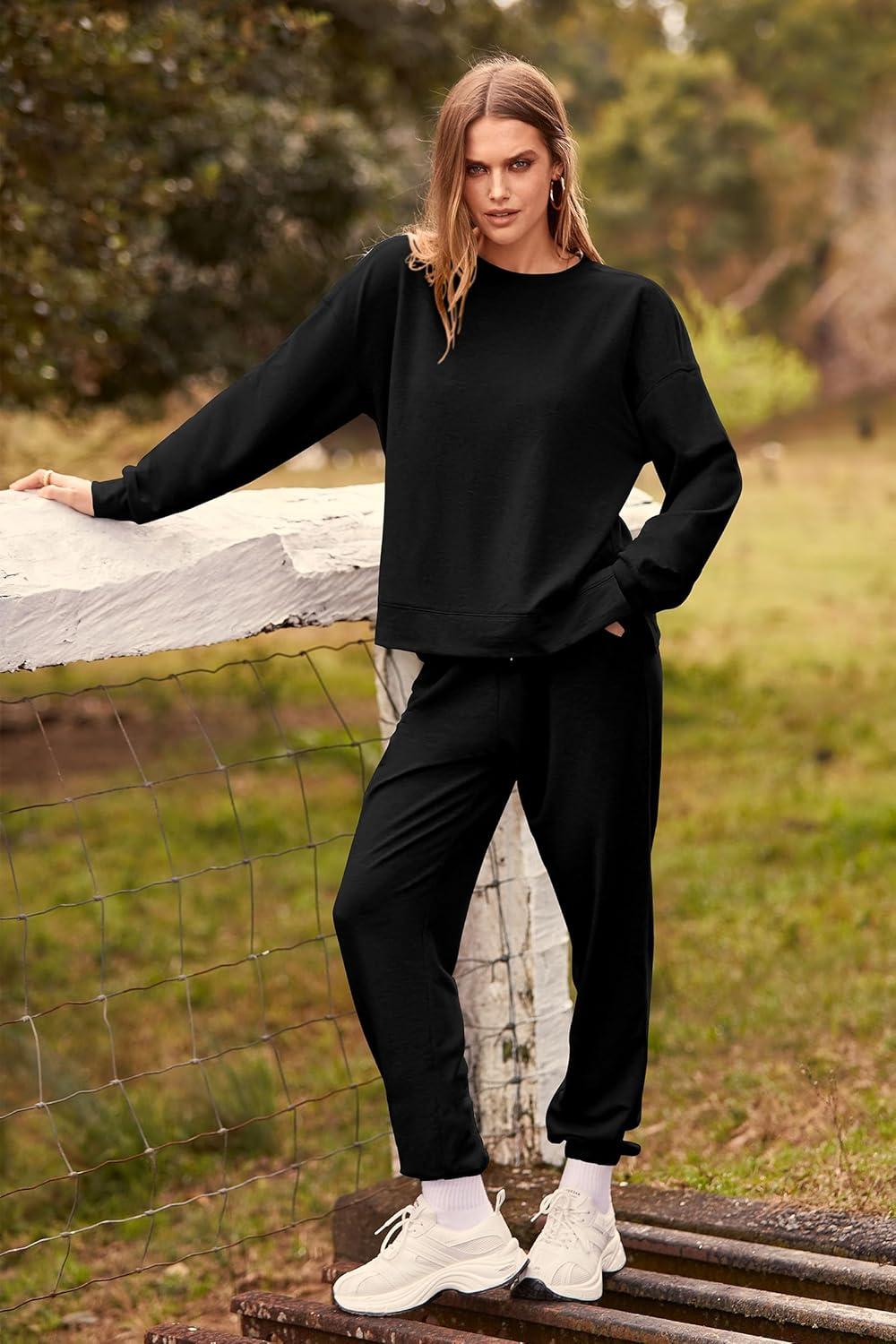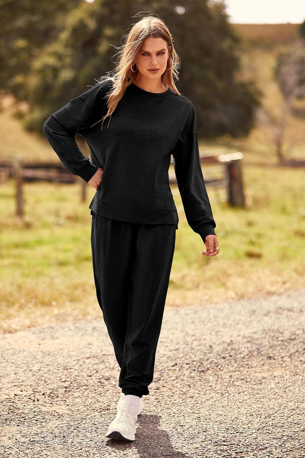 PRETTYGARDEN Women’s Two Piece Loungewear Fall Casual Long Sleeve Tops Jogger Pants Pajama Sets Matching Outfits Clothing(Solid Black)
