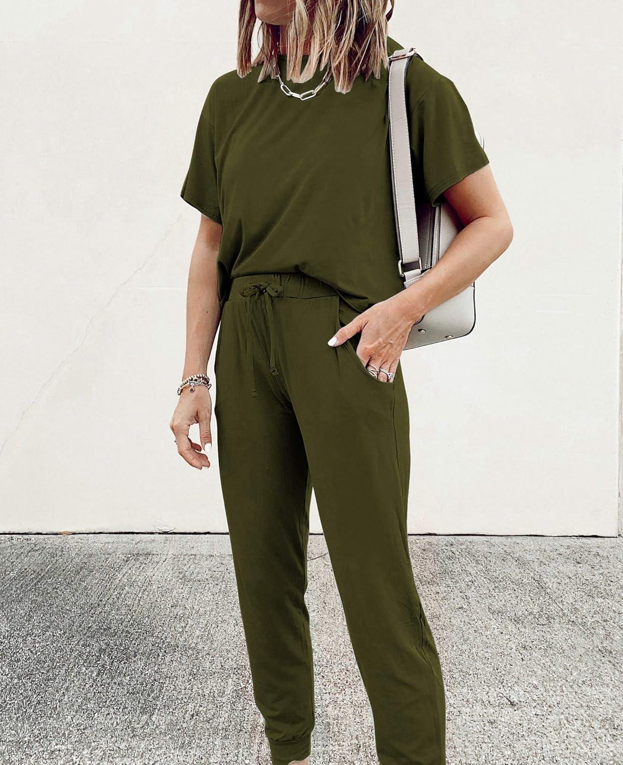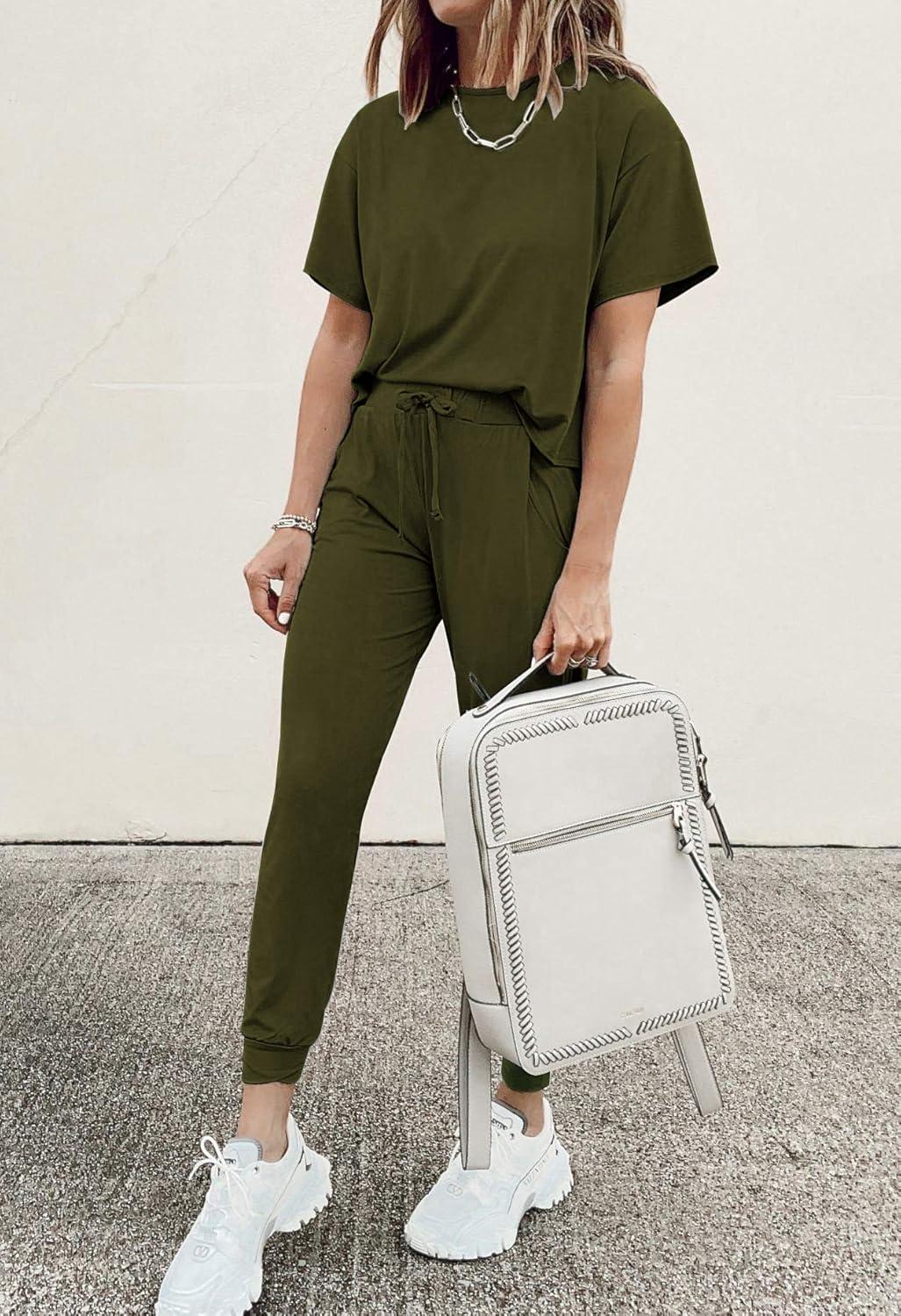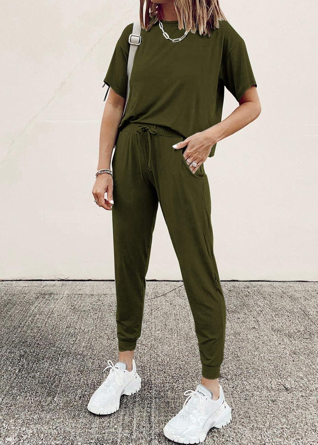 PRETTYGARDEN Women's Two Piece Sets 2025 Summer Spring Jogger Pants Travel Vacation Lounge Outfits Airplane Matching Clothes(Army Green)