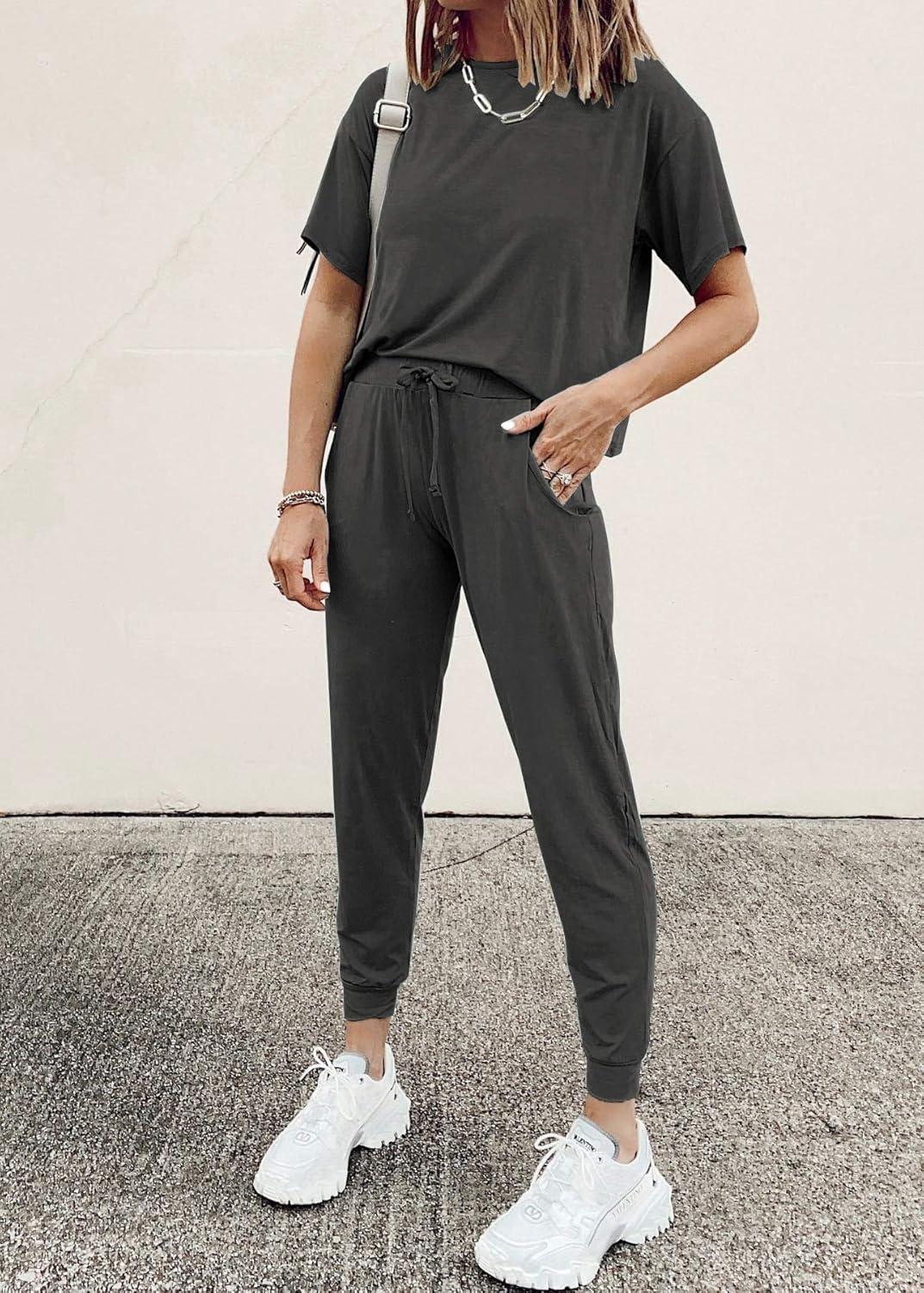 PRETTYGARDEN Women's Two Piece Sets 2025 Summer Spring Jogger Pants Travel Vacation Lounge Outfits Airplane Matching Clothes(Dark Grey)