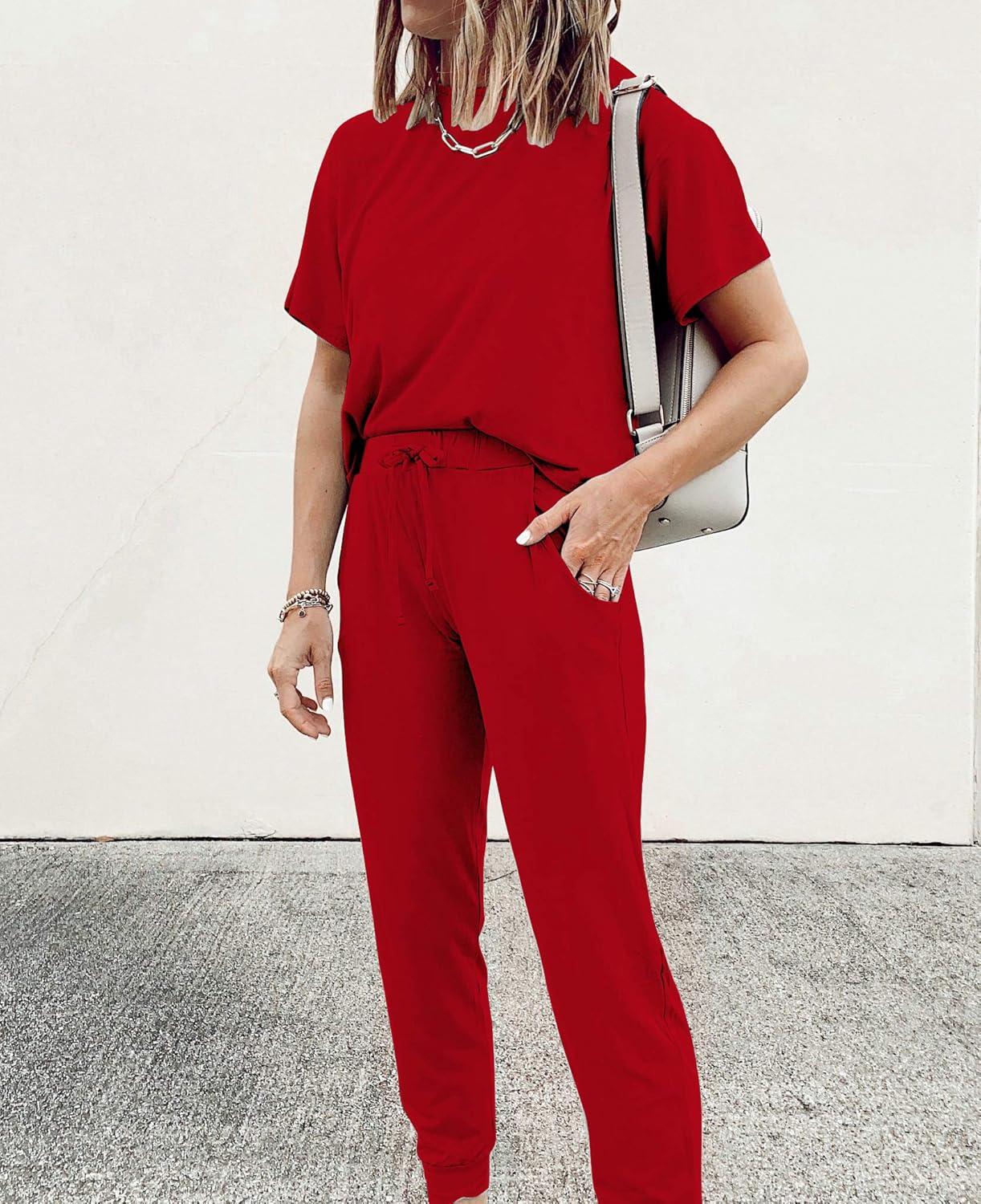 PRETTYGARDEN Women's Two Piece Sets 2025 Summer Spring Jogger Pants Travel Vacation Lounge Outfits Airplane Matching Clothes(Red)