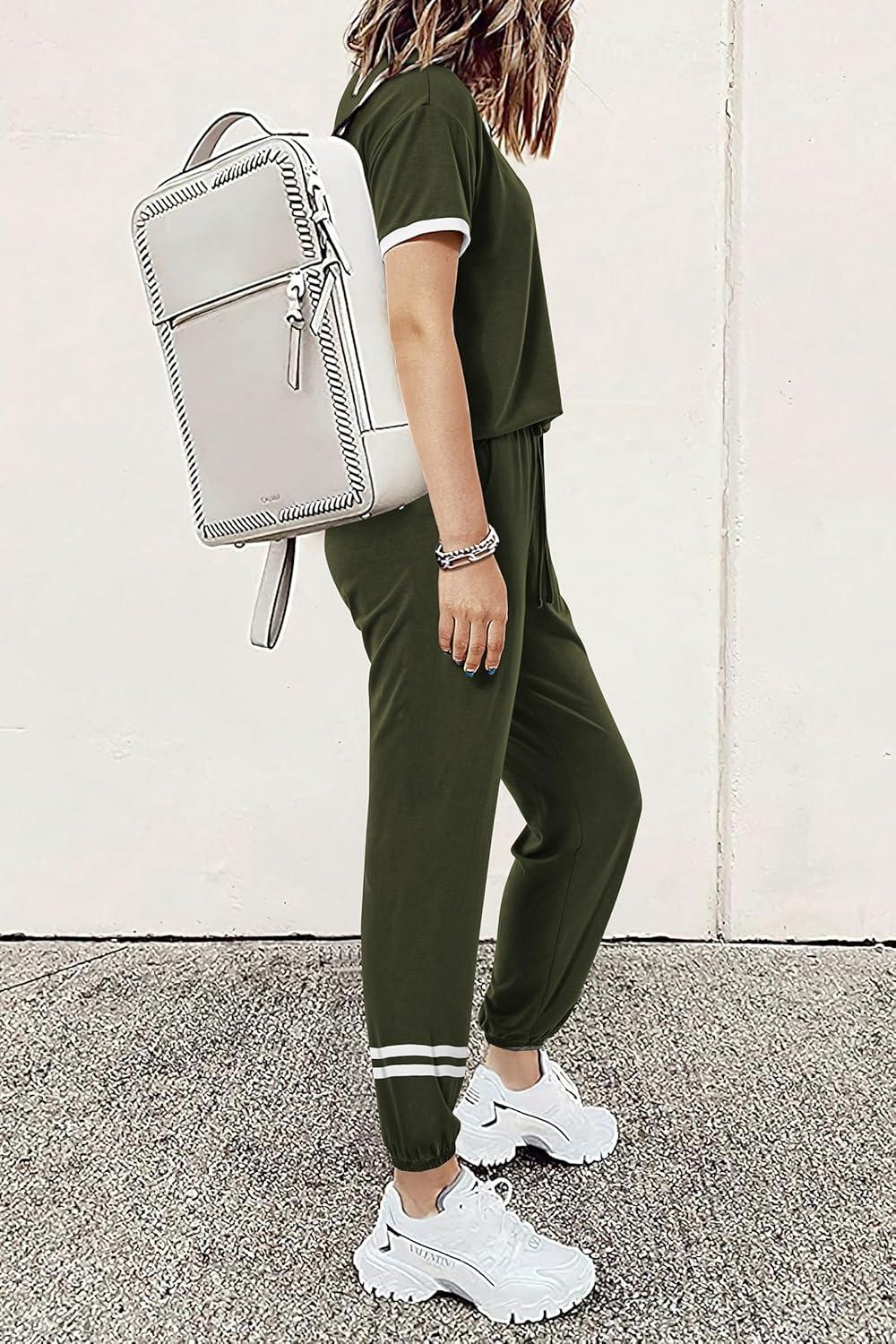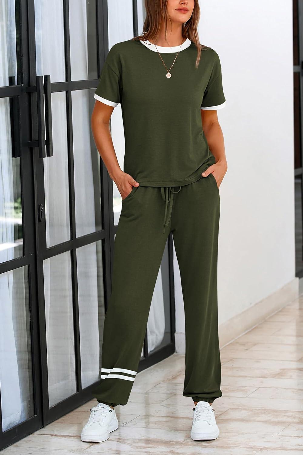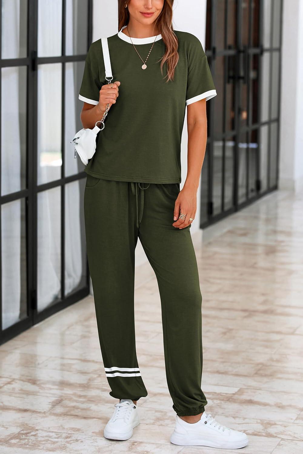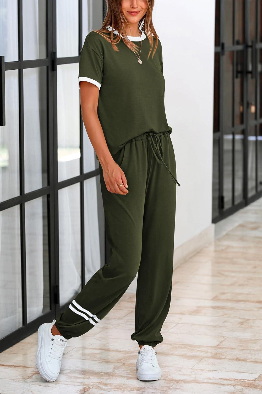 PRETTYGARDEN Women's Two Piece Sets 2025 Summer Spring Jogger Pants Travel Vacation Lounge Outfits Airplane Matching Clothes(Stripes Army Green)