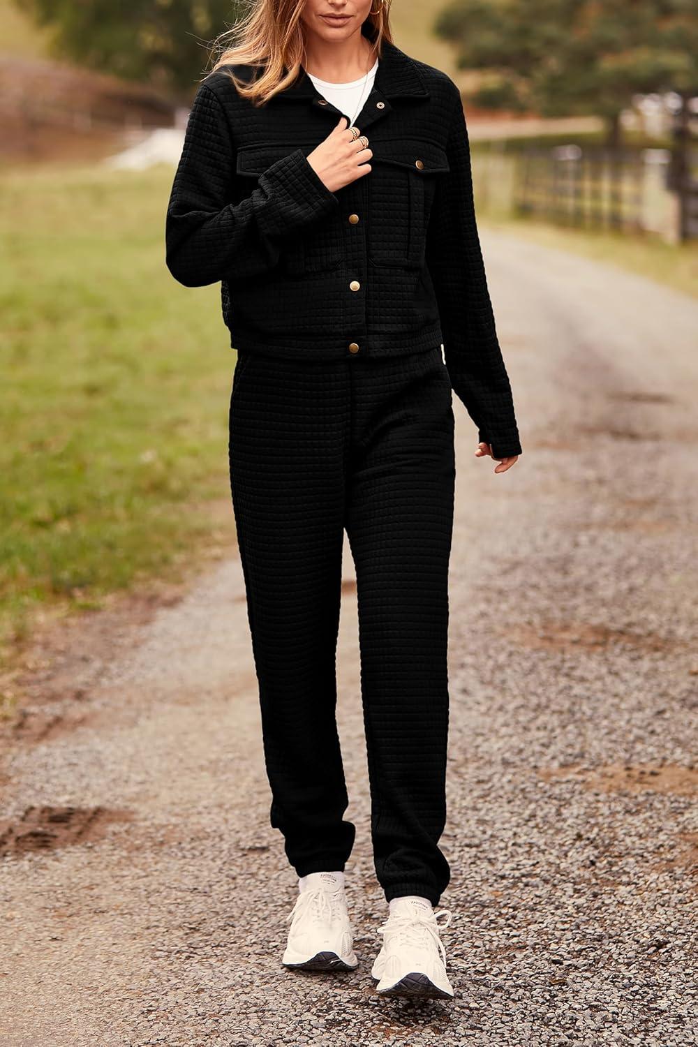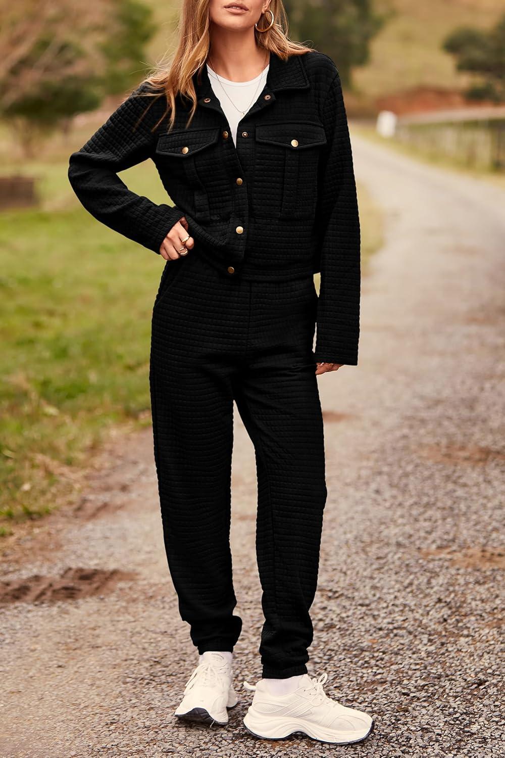 PRETTYGARDEN Womens Two Piece Sets Fall 2025 Long Sleeve Button Down Shacket Jacket Long Sweatpants Tracksuit Winter Clothes(Black)