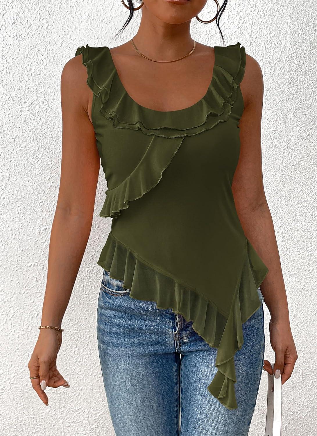 PRETTYGARDEN Women's Y2K Going Out Crop Top 2024 Summer Sleeveless Asymmetrical Mesh Tank Top Fitted Party Tops(Army Green)