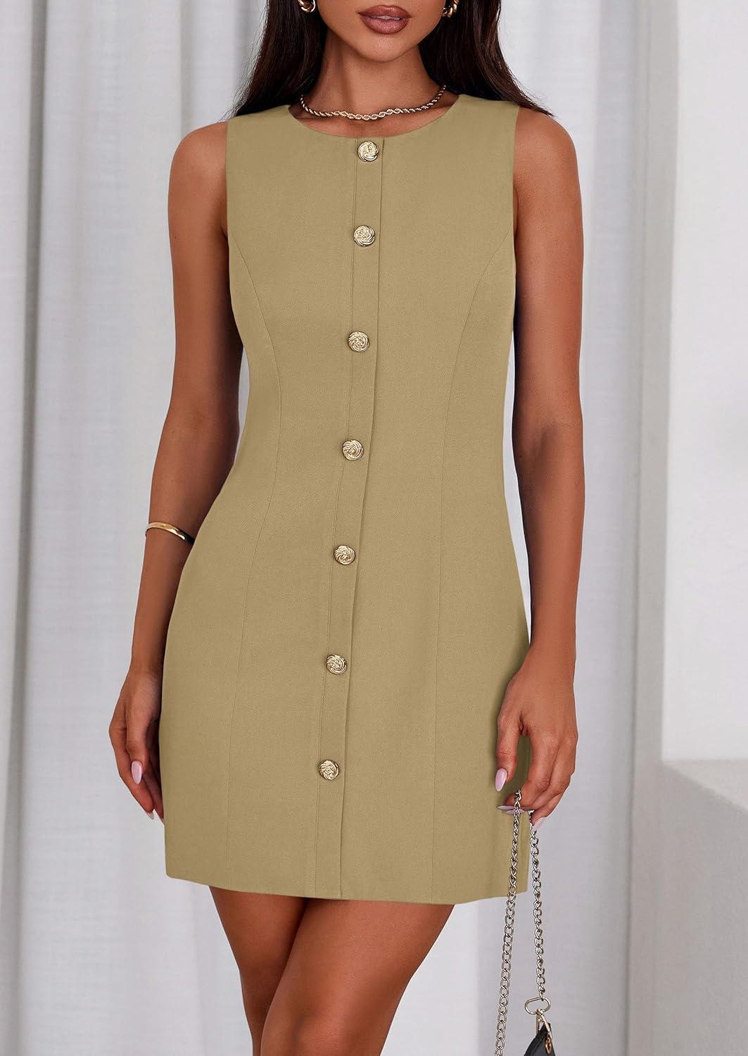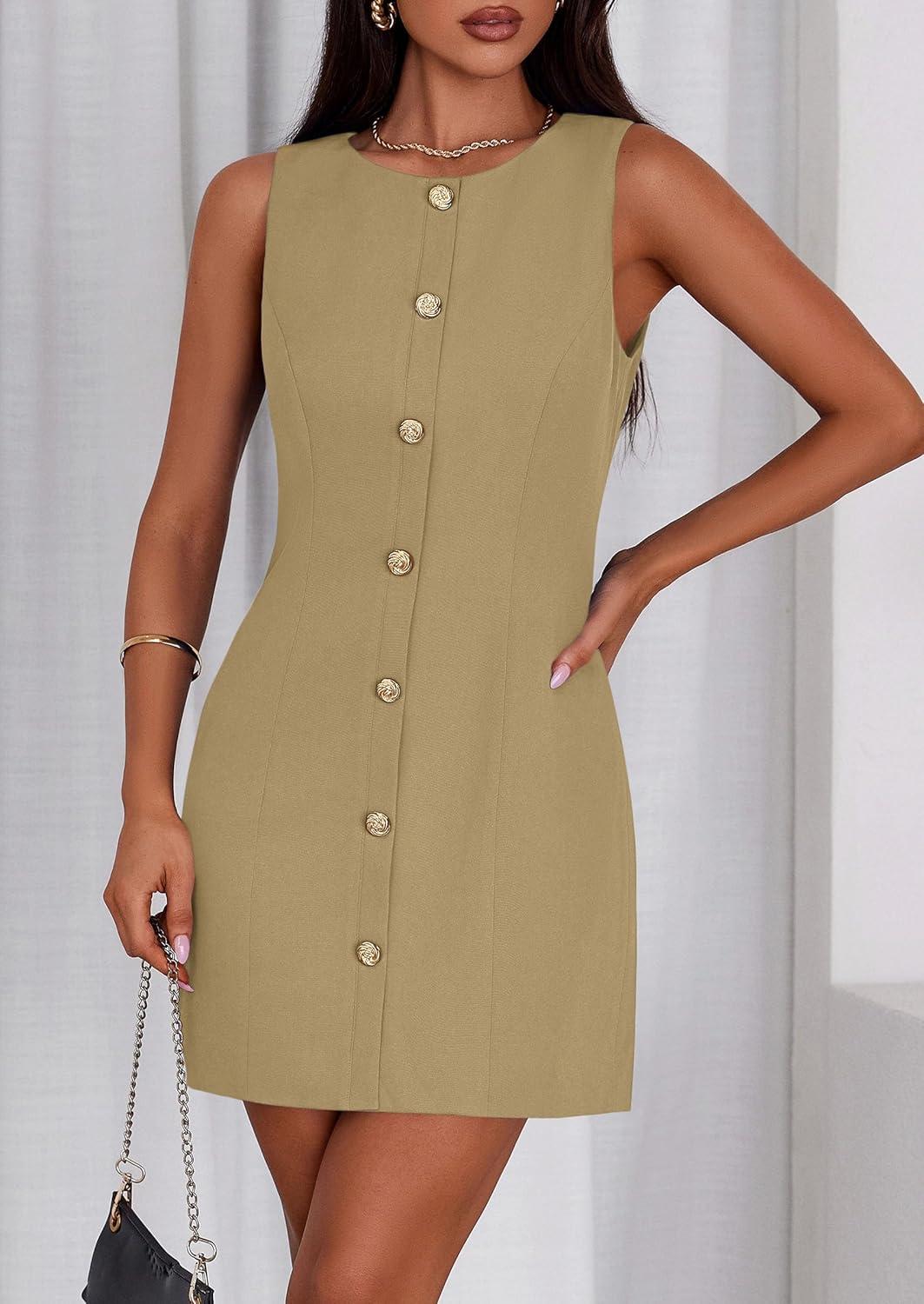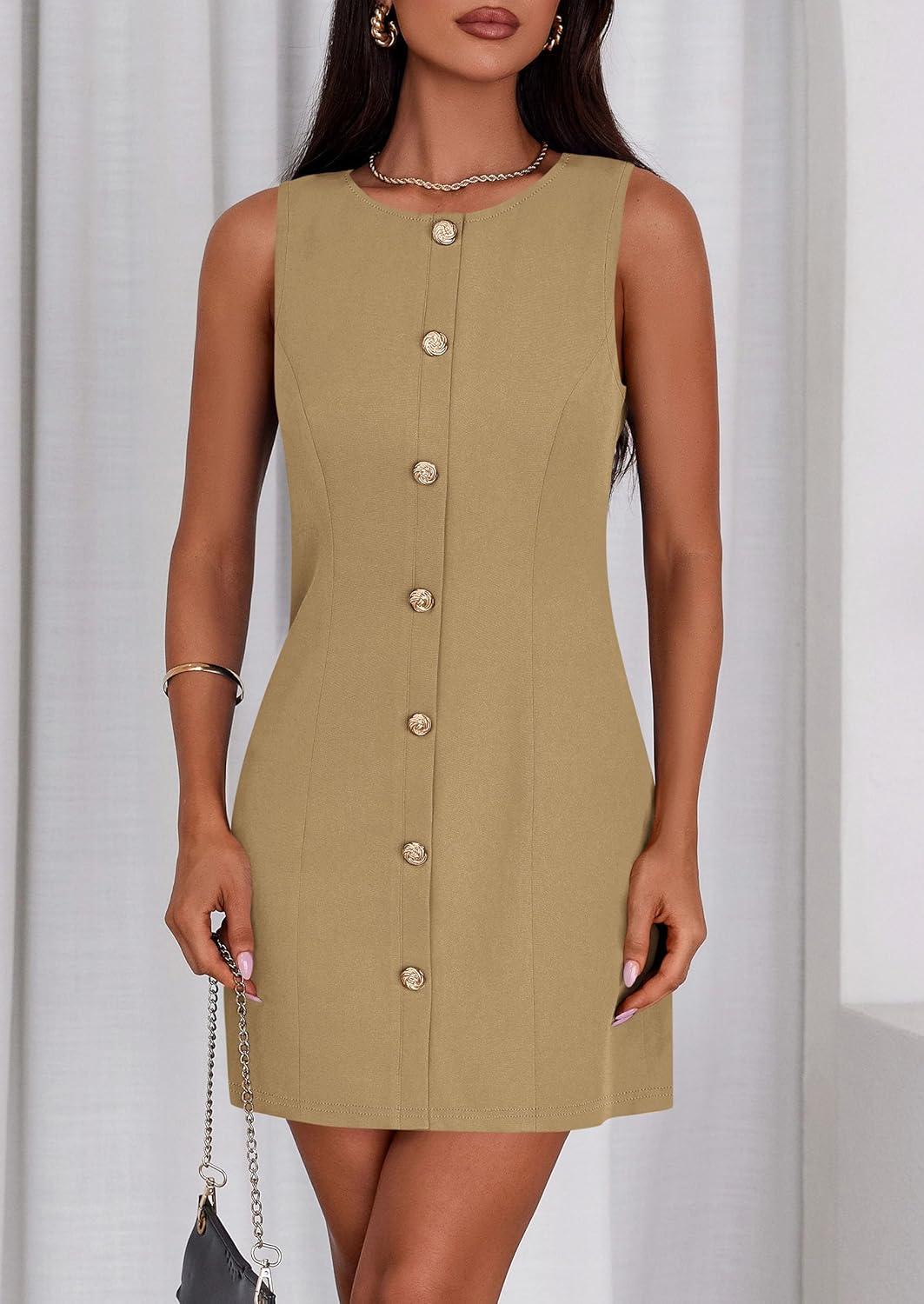 PRETTYGARDEN Work Dresses for Women 2025 Summer Business Formal Short Dress Sleeveless Button Down Elegant Office Outfits(Khaki)